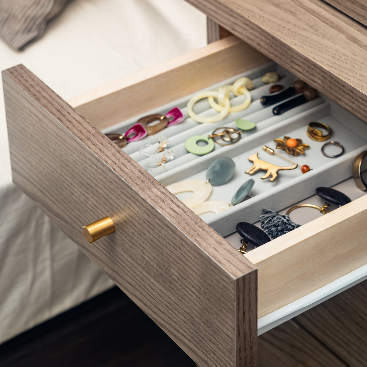 真鍮の取手とダークグレー+ゴールド(アルミ製)の脚の組み合わせが落ち着きのある上品な雰囲気です。