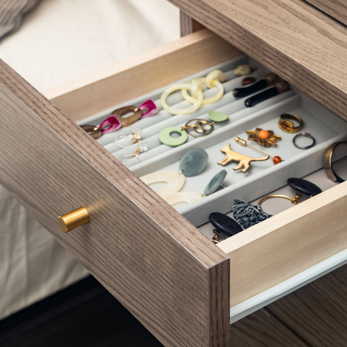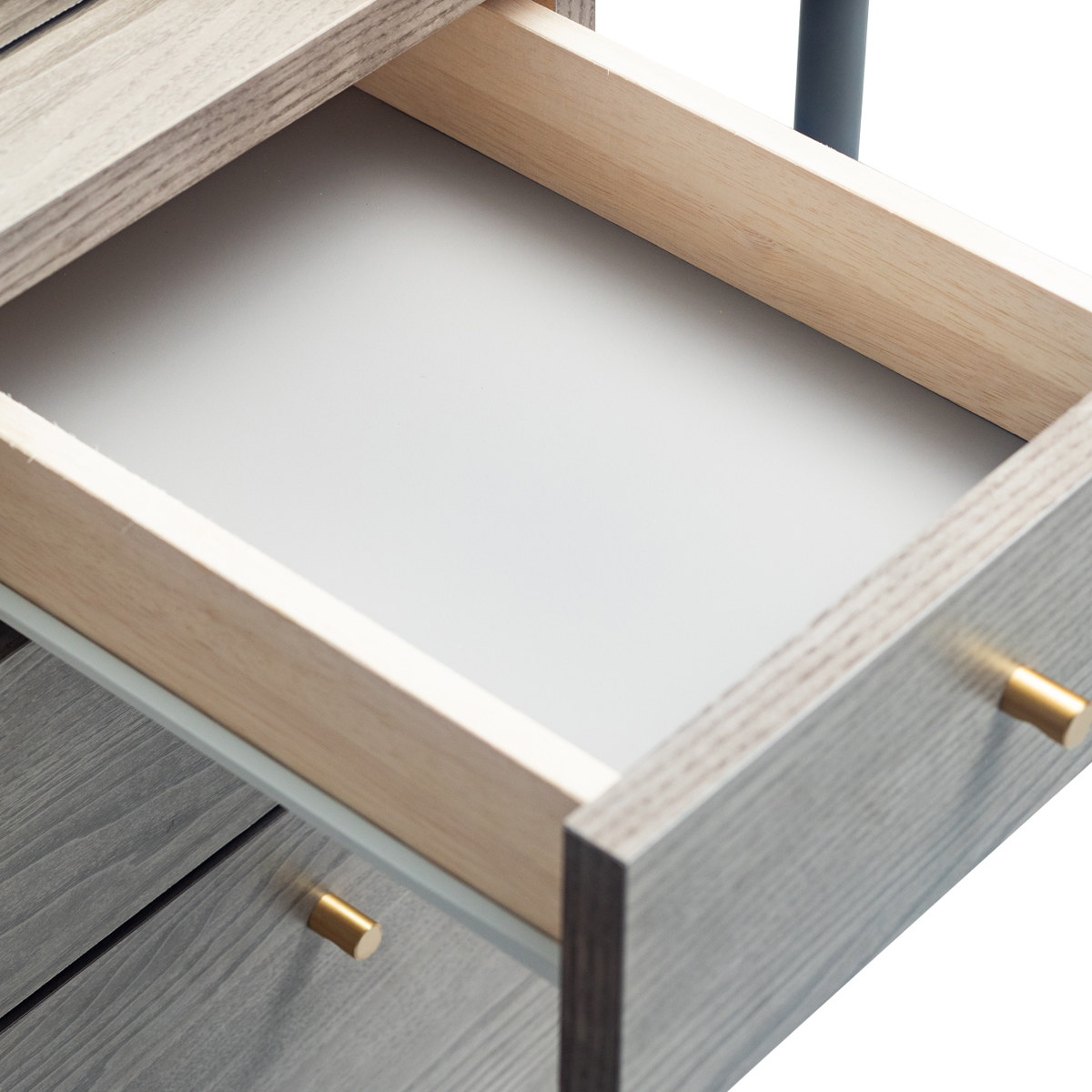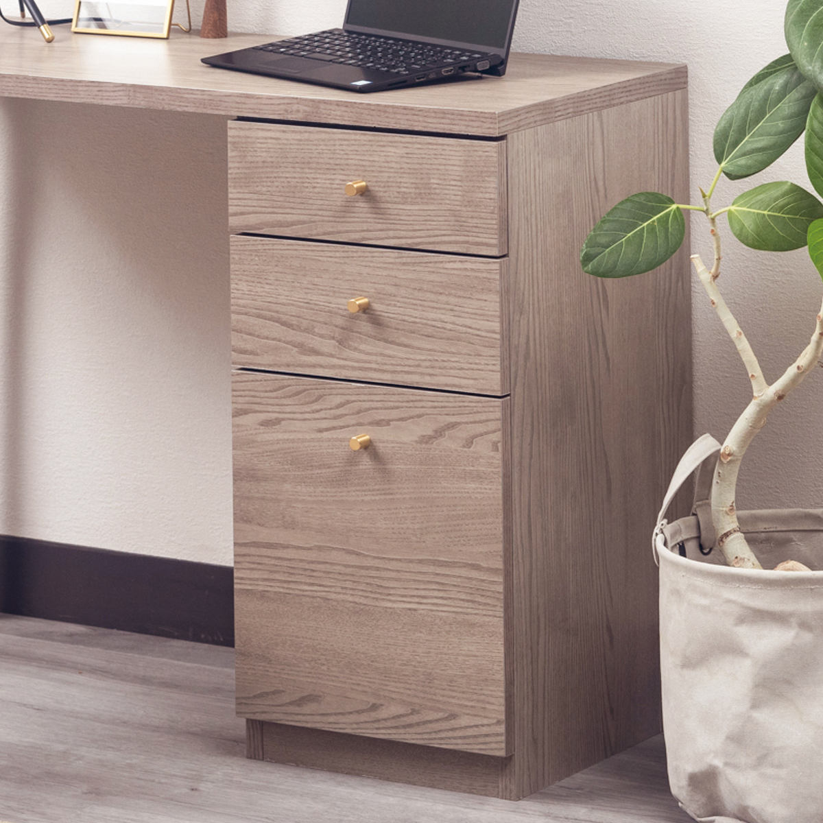 引出しは、豊富な収納力を備えた3段タイプです。お部屋のレイアウトに合わせて左右どちらにも取り付けることができます。