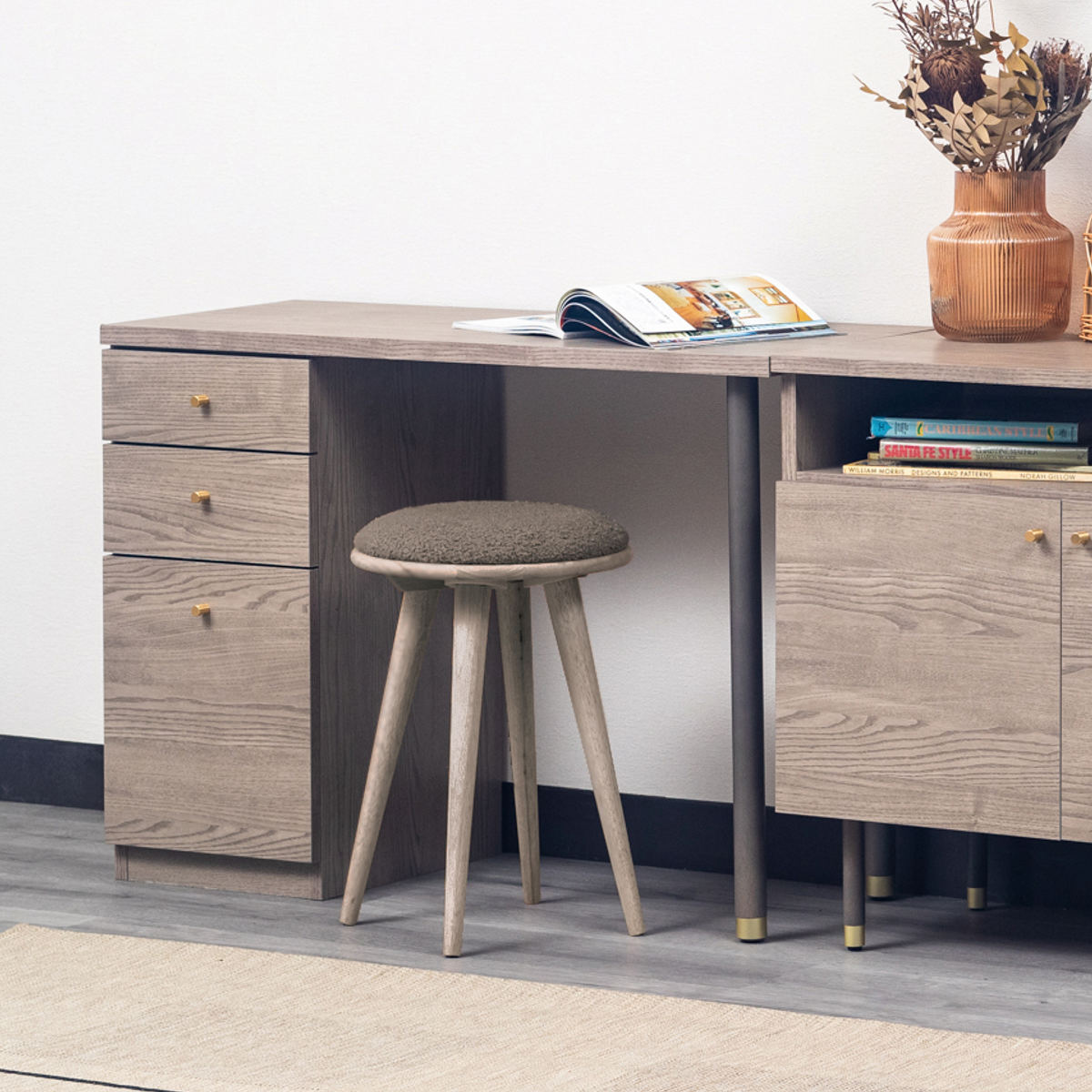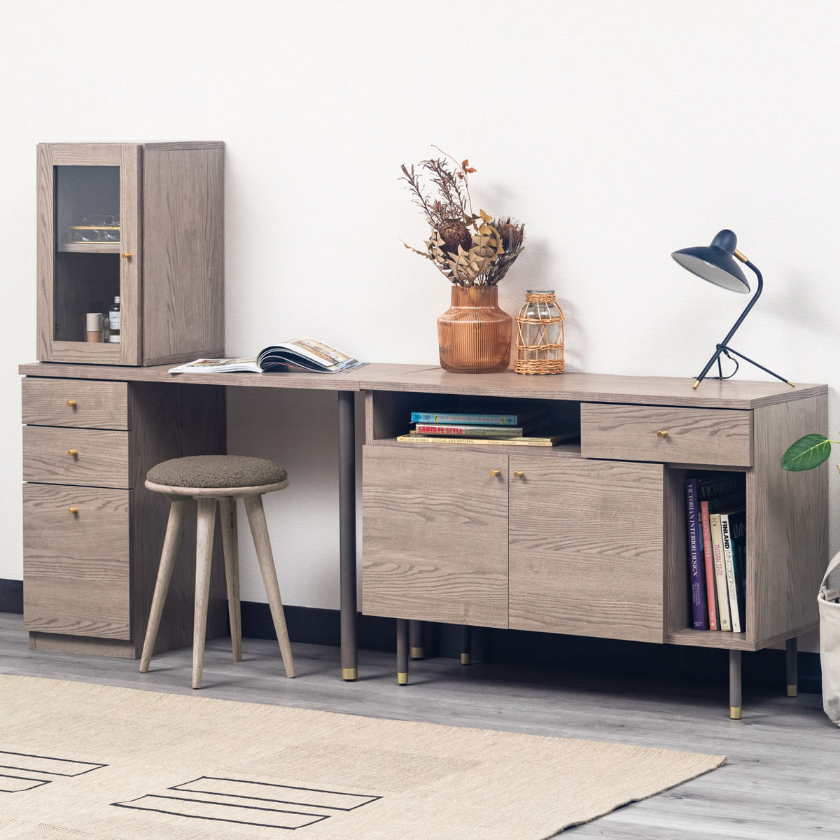デスクとドレッサーの2way使いが叶うドレッサーデスクです。デスク、引出し収納、ガラスキャビネットの3点セットです。暮らしに馴染み、長くお使いいただけるよう考えられた収納シリーズです。