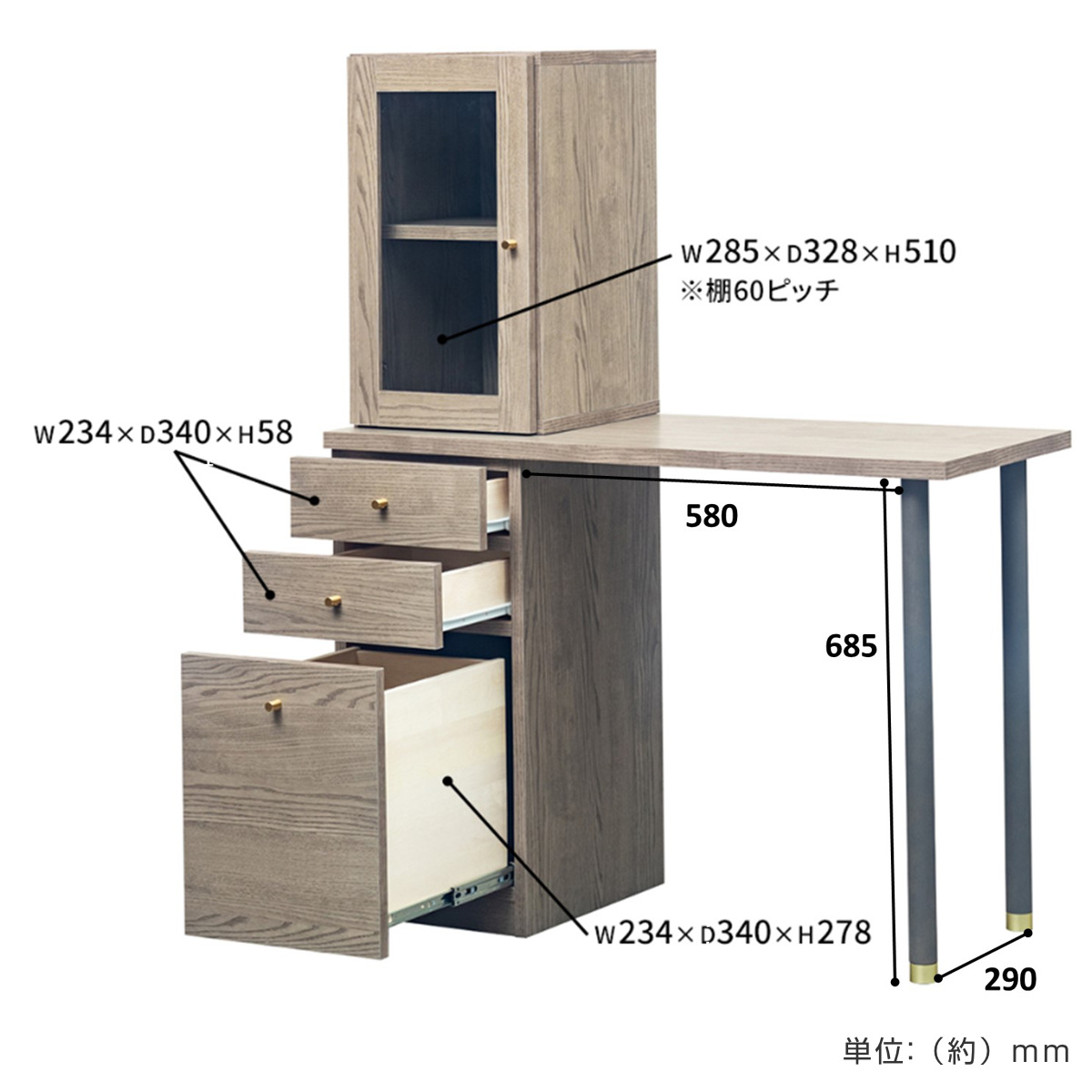 ※こちらはデスク、引出し収納、ガラスキャビネットの3点セットの販売ページです