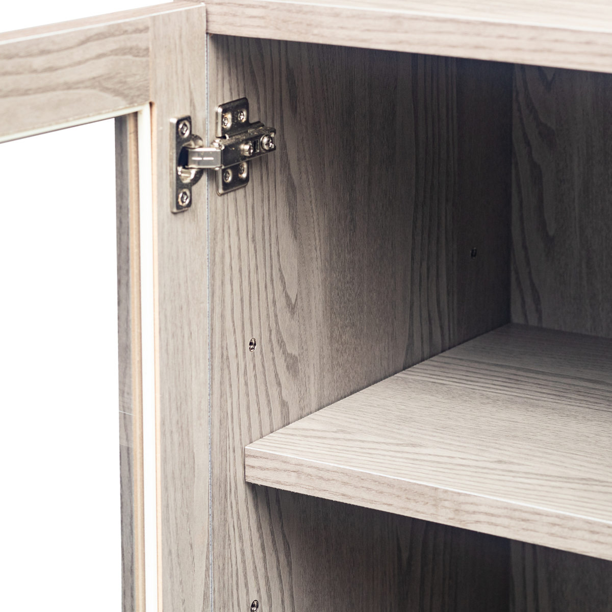 棚板の高さは3段階で変えられるガラスキャビネットです。組立時に左右どちらでも取り付け可能です。