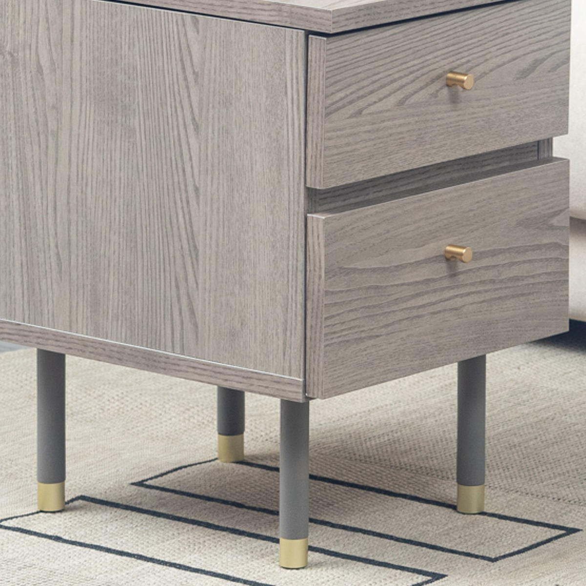 真鍮の取手とダークグレー、ゴールド(アルミ製)の脚の組み合わせが落ち着きのある上品な雰囲気です。