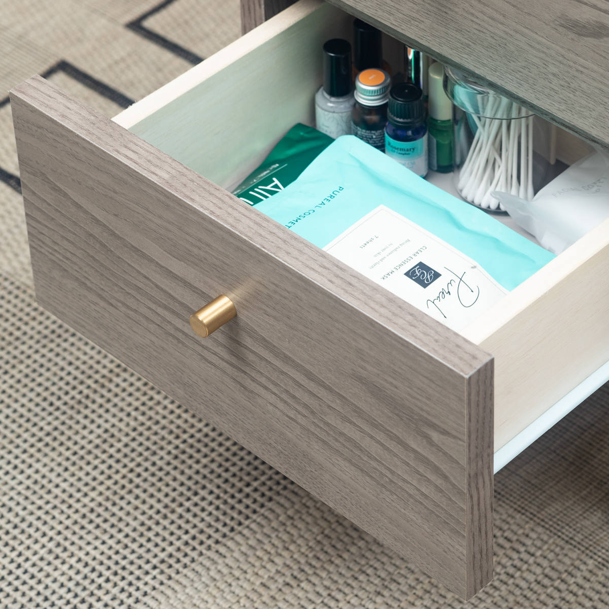 | 材質 | プリント紙化粧繊維板 脚:ラバーウッド無垢、アルミ 取手:真鍮 |