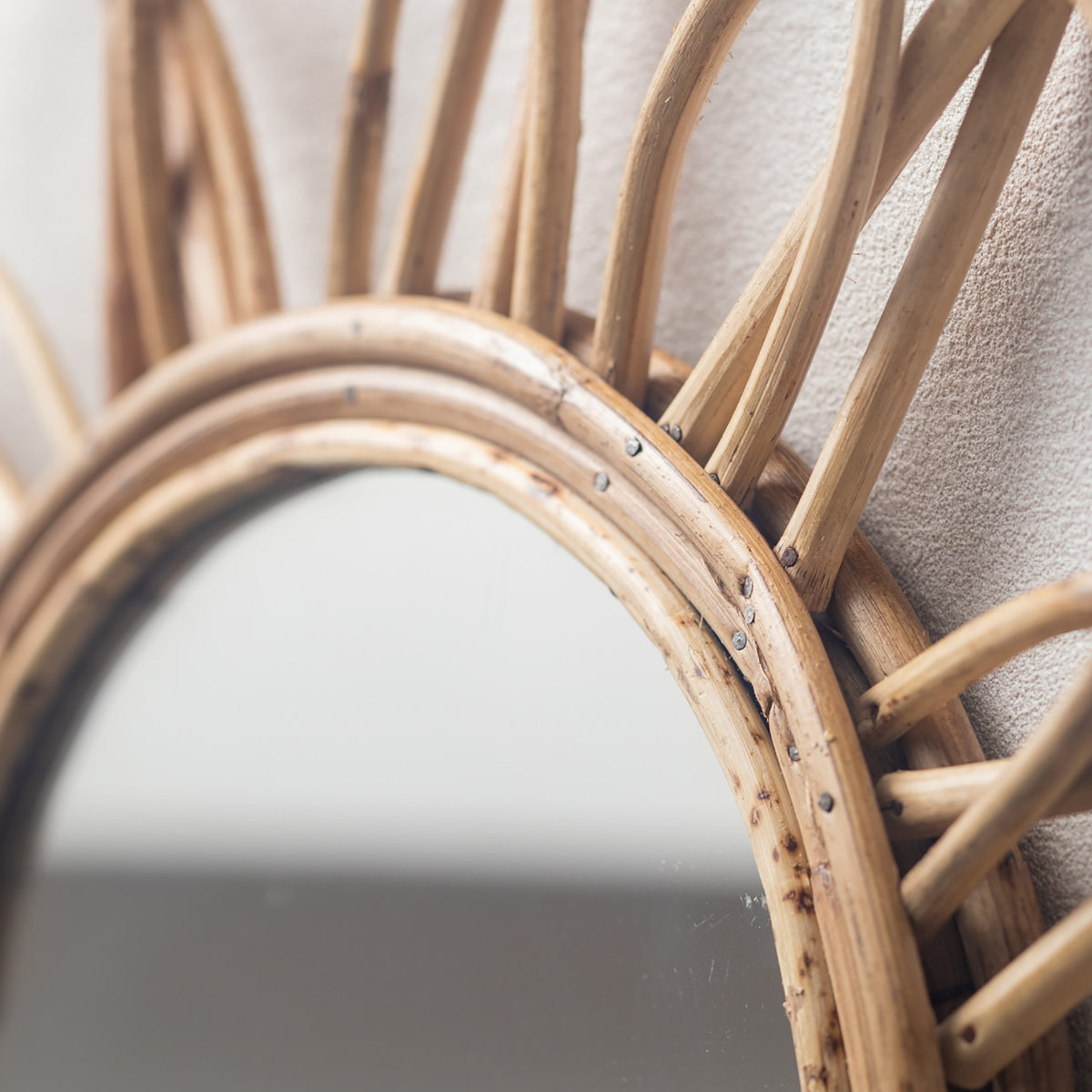 ラタンを丁寧に編み込まれて作られたお洒落で可愛いウォールミラーです。素材の温もりを感じるどこか懐かしいデザインで、置いておくだけでもインテリアのアクセントになります。使えば使うほどに味わいが増し、ラタンならではの経年変化もお楽しみいただけます。