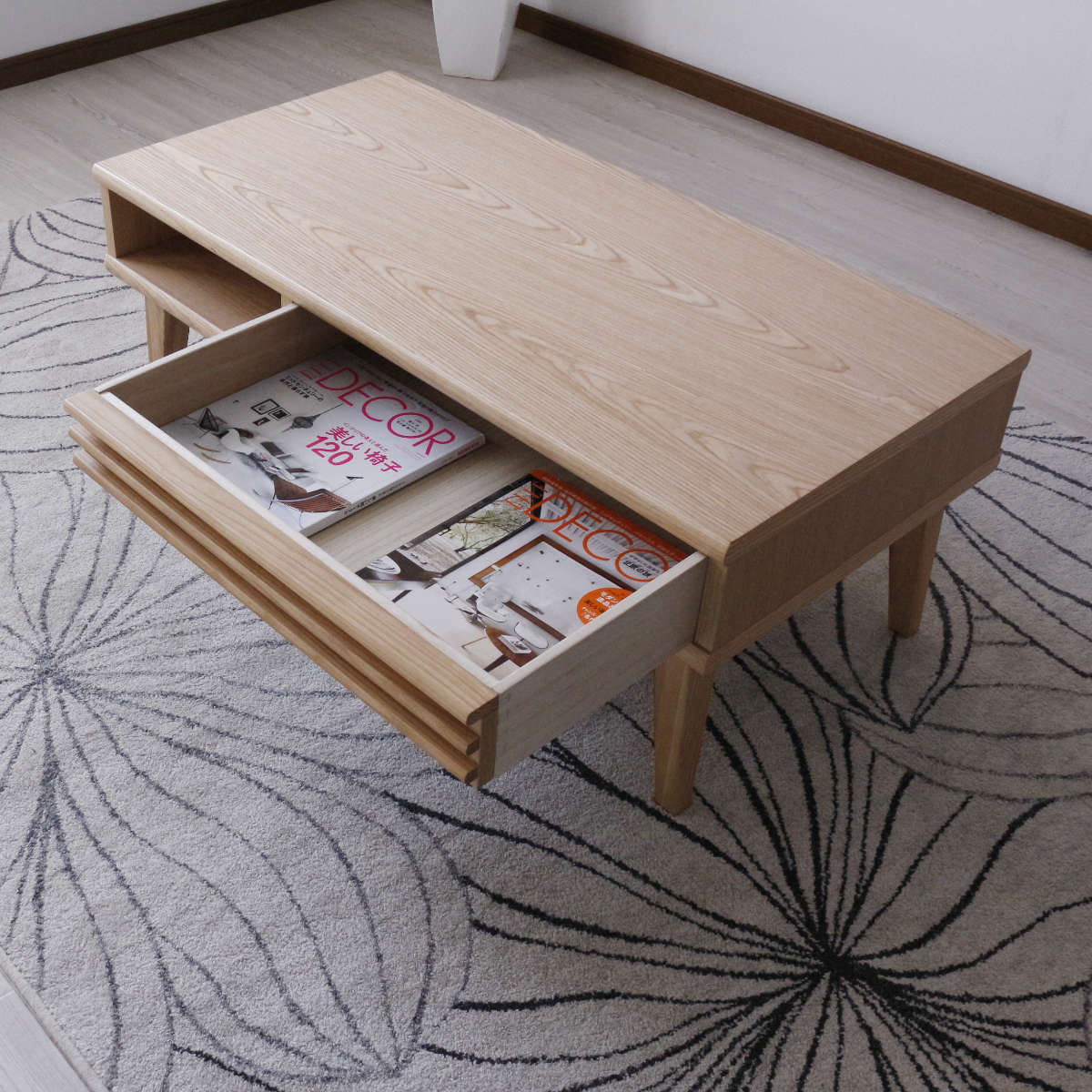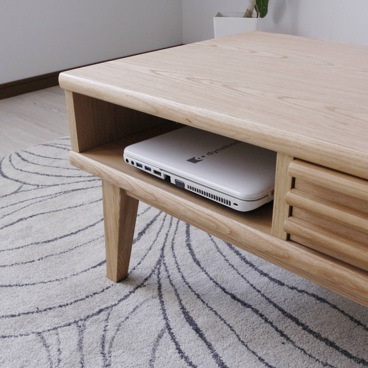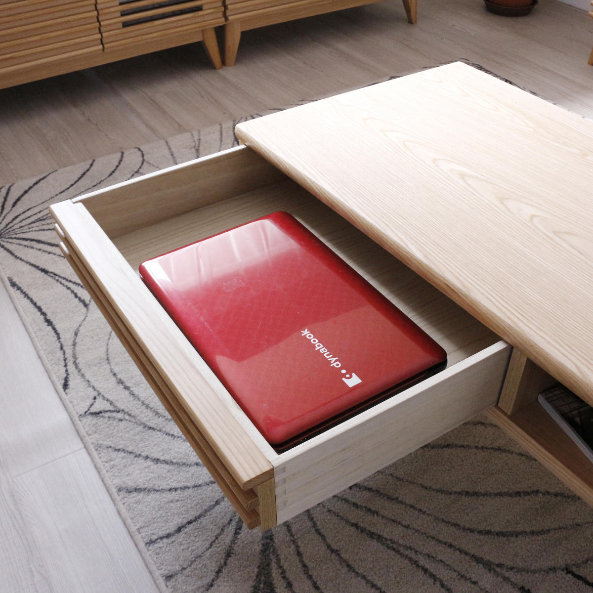 使い勝手の良い前後どちらからでも使用できる引き出しです。雑誌や新聞、小物の整理整頓ができ、ノートパソコンの収納も可能です。