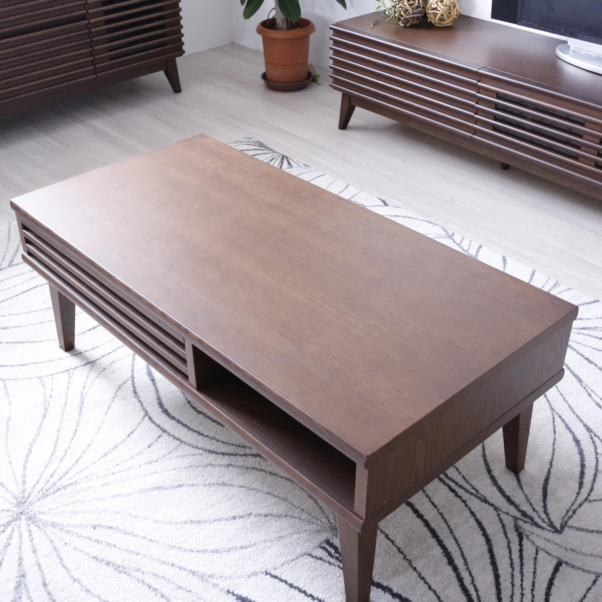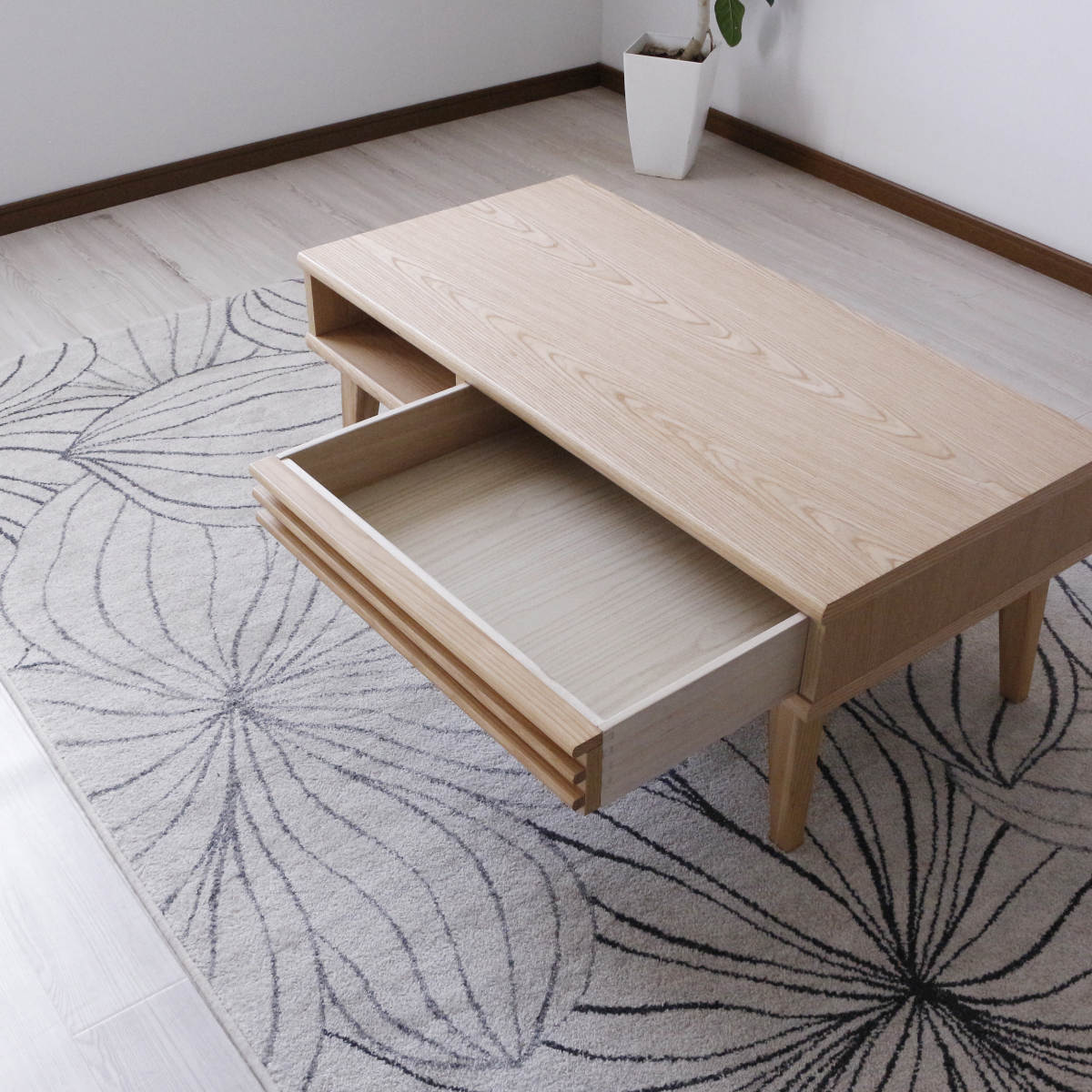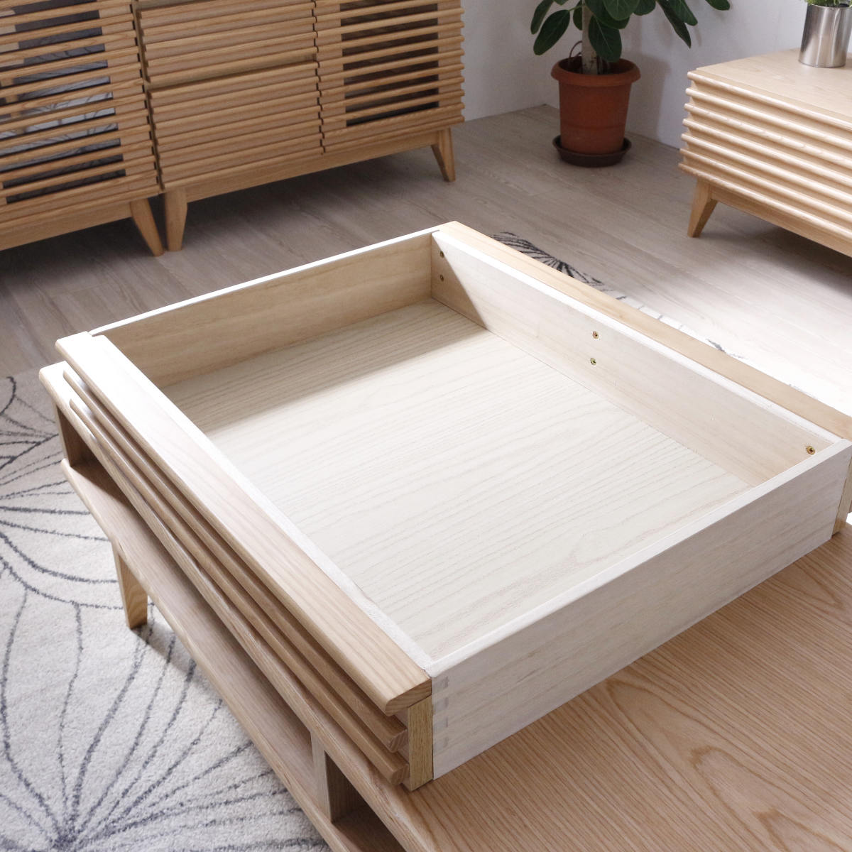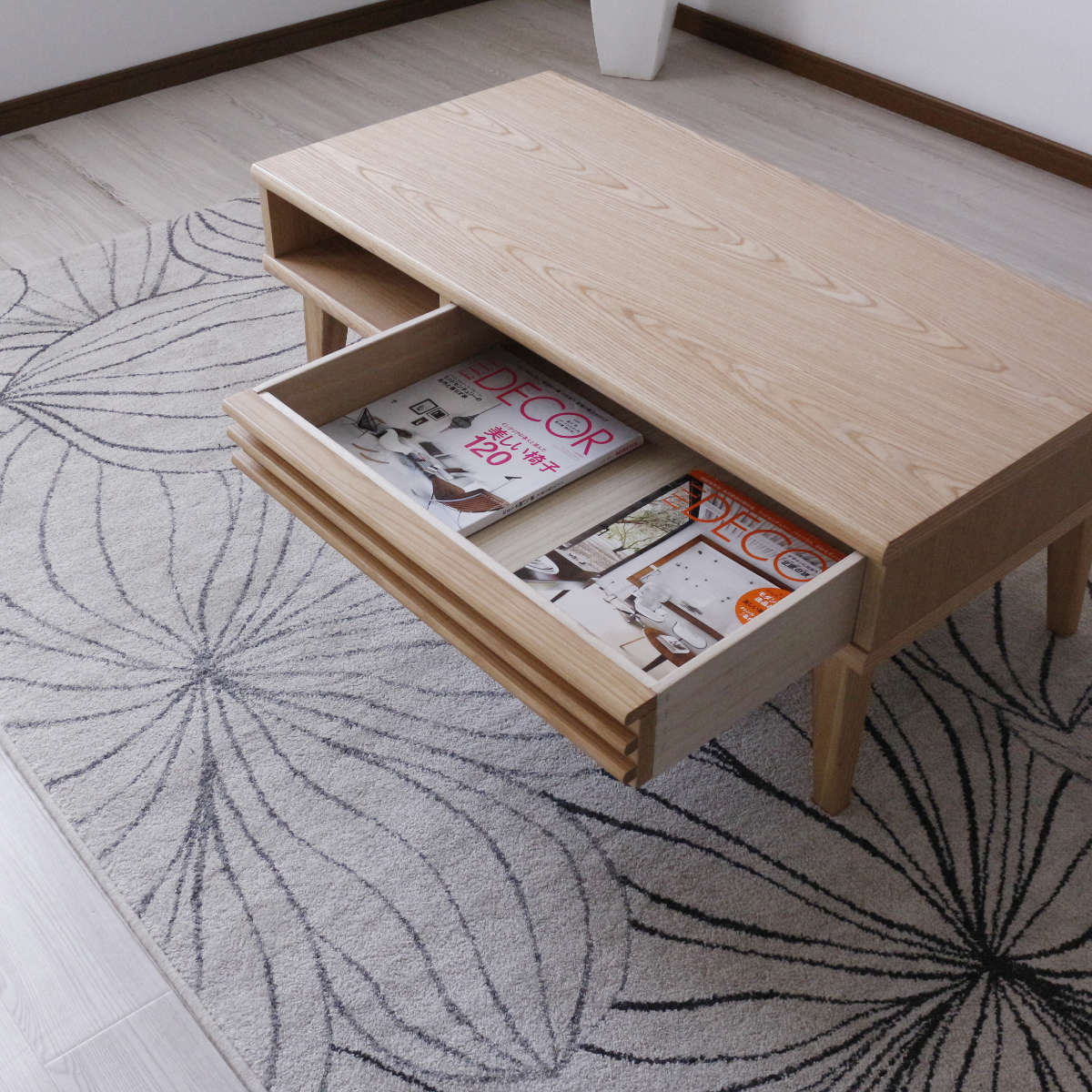 使い勝手の良い前後どちらからでも使用できる引き出しです。雑誌や新聞、小物の整理整頓ができ、ノートパソコンの収納も可能です。