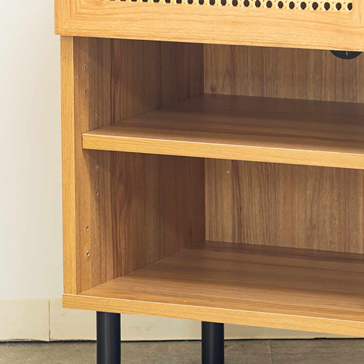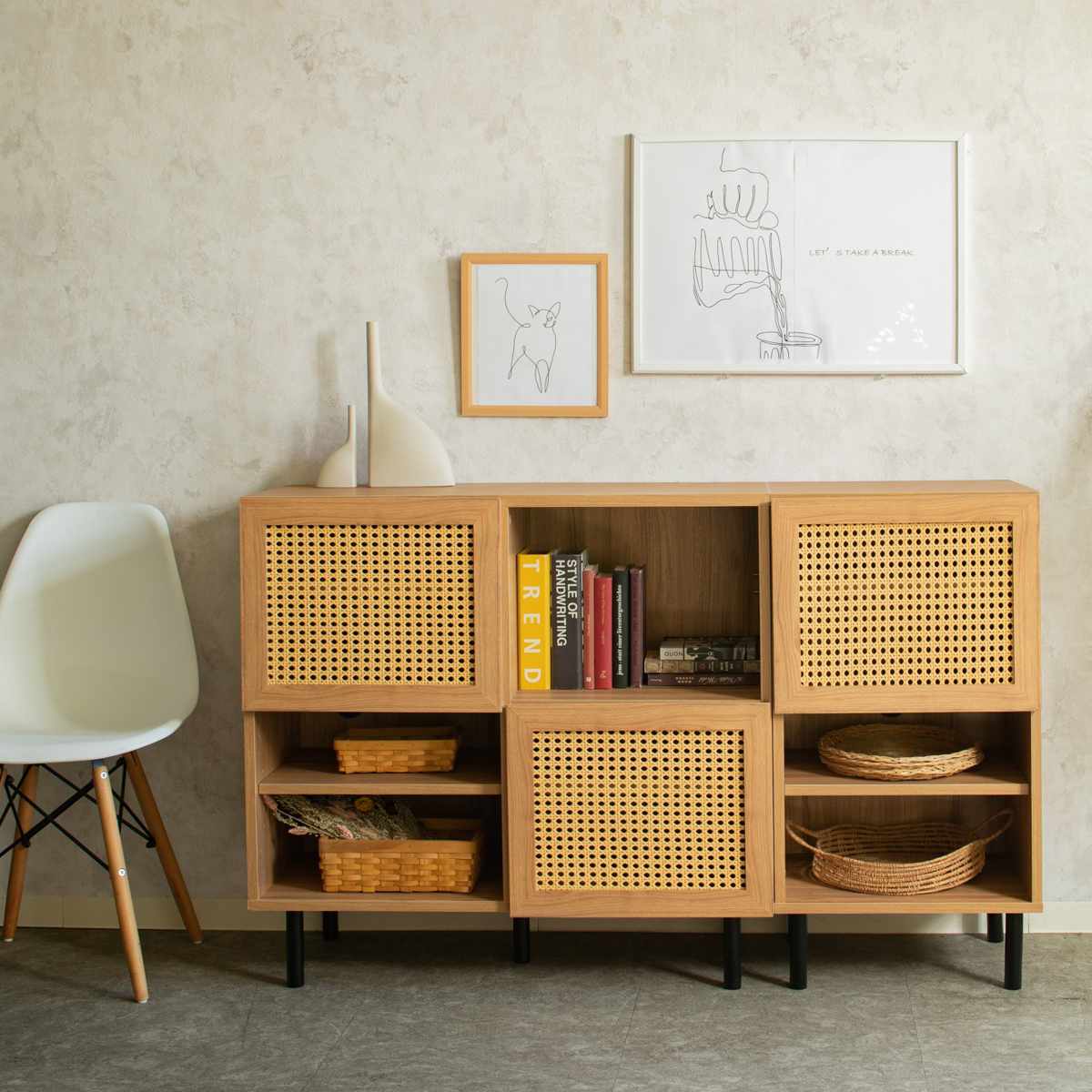 「マルシェ」シリーズのキャビネットです。ナチュラルな木目柄に、ラタン調のかごめ編みの扉が付いたかわいらしい韓国風デザインです。黒脚とのコントラストがアクセントになっています。