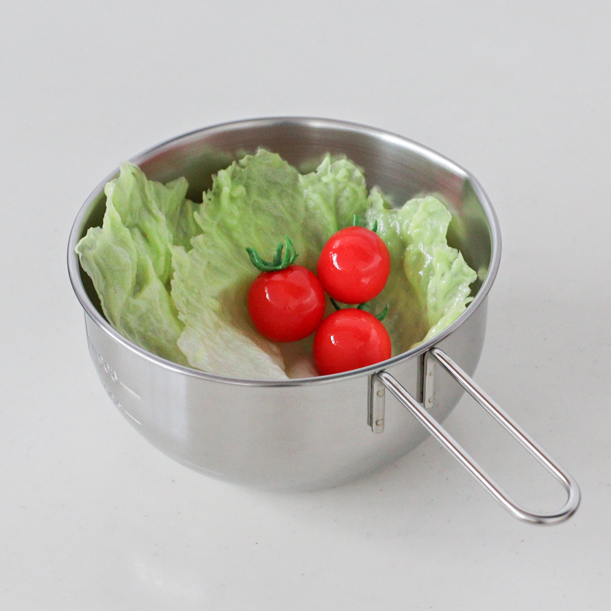 持ち手が付いたステンレス製の手付きボウルです。1人分のサラダを和えたり、少量の野菜の下ごしらえやデザート作りなどに重宝するサイズです。少量ずつ丁寧に準備したいお子さまの離乳食作りにも便利に使えます。