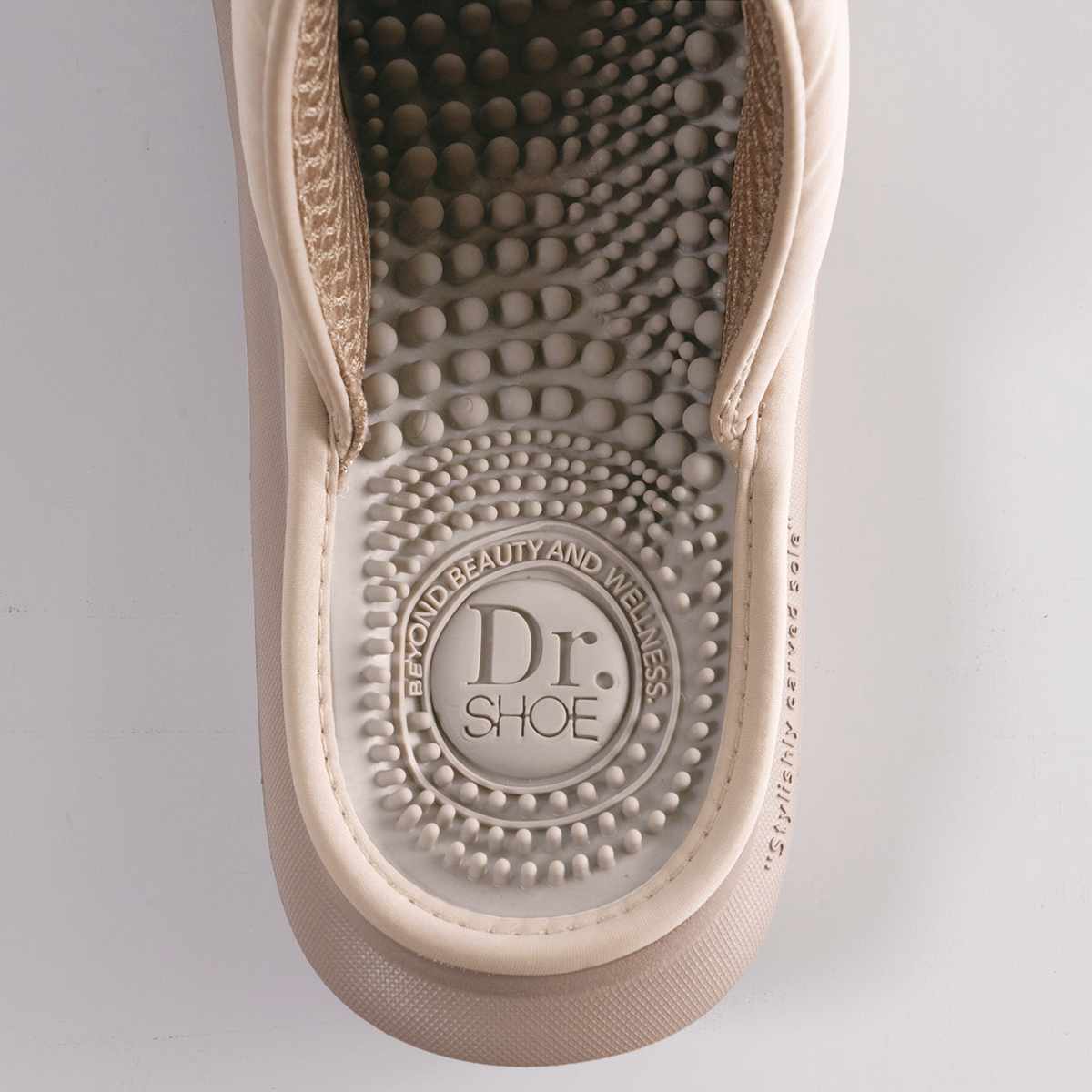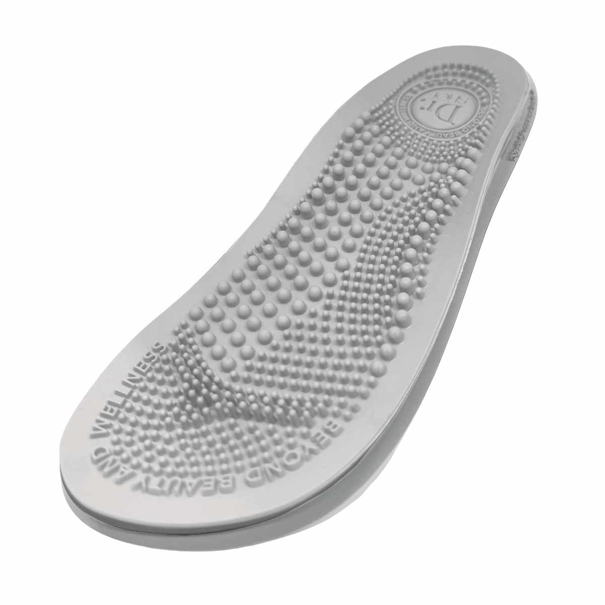 立体インソールが足裏にフィットし、体重を支え衝撃を吸収します。土踏まず部分の突起が足のアーチをしっかり支えます。歩行しながら指圧することで、健康をサポートします。