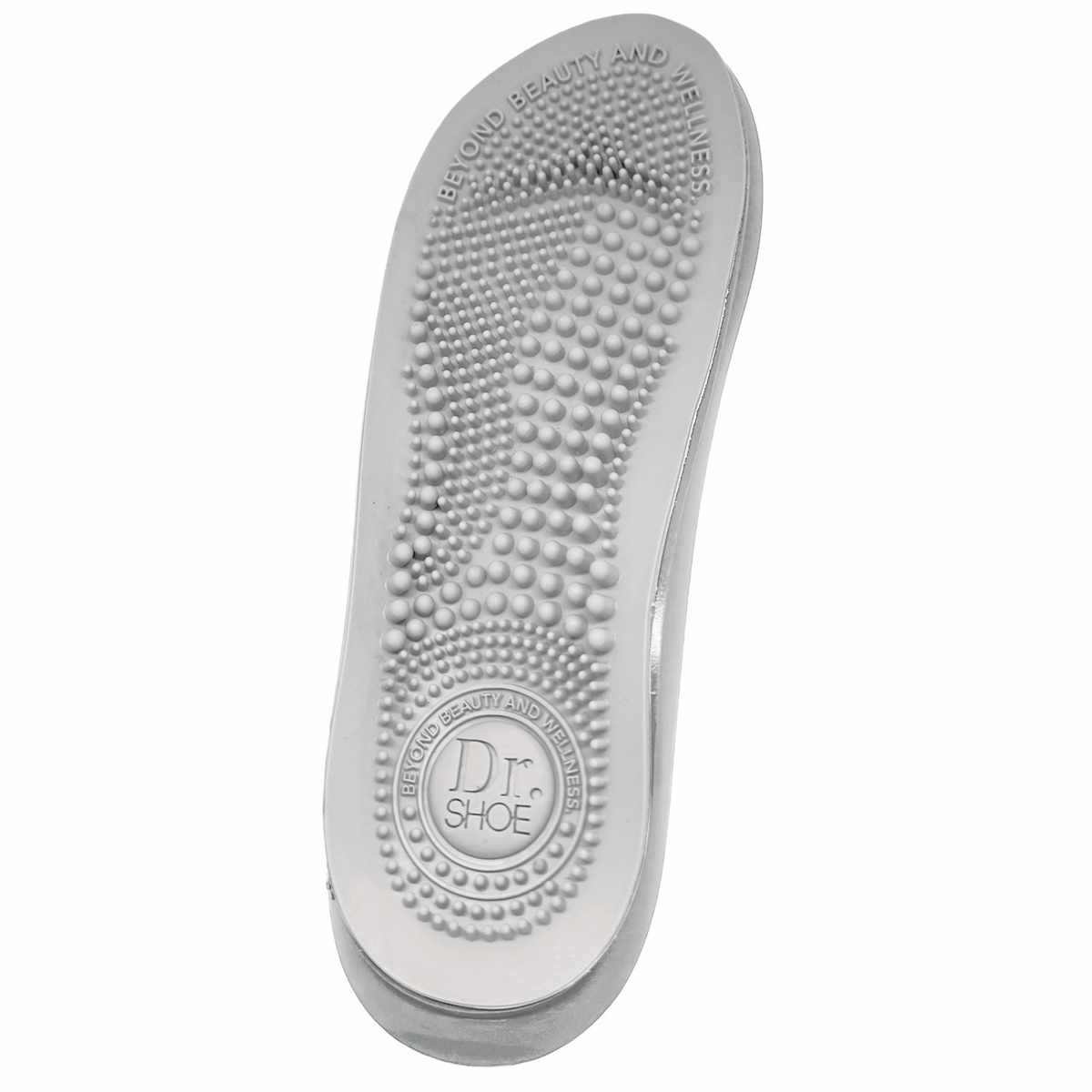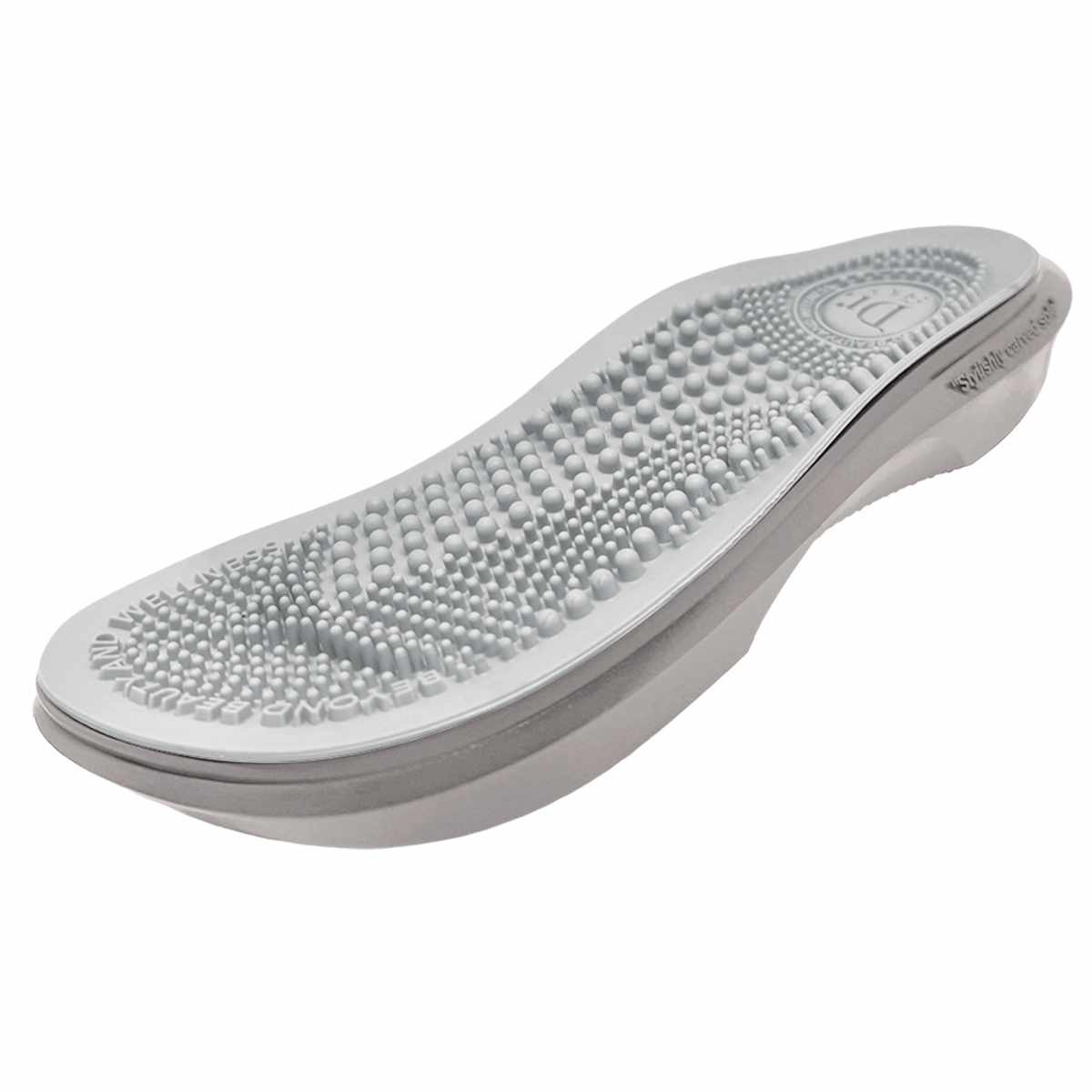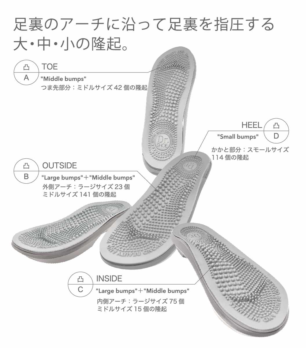 立体インソールが足裏にフィットし、体重を支え衝撃を吸収します。土踏まず部分の突起が足のアーチをしっかり支えます。歩行しながら指圧することで、健康をサポートします。