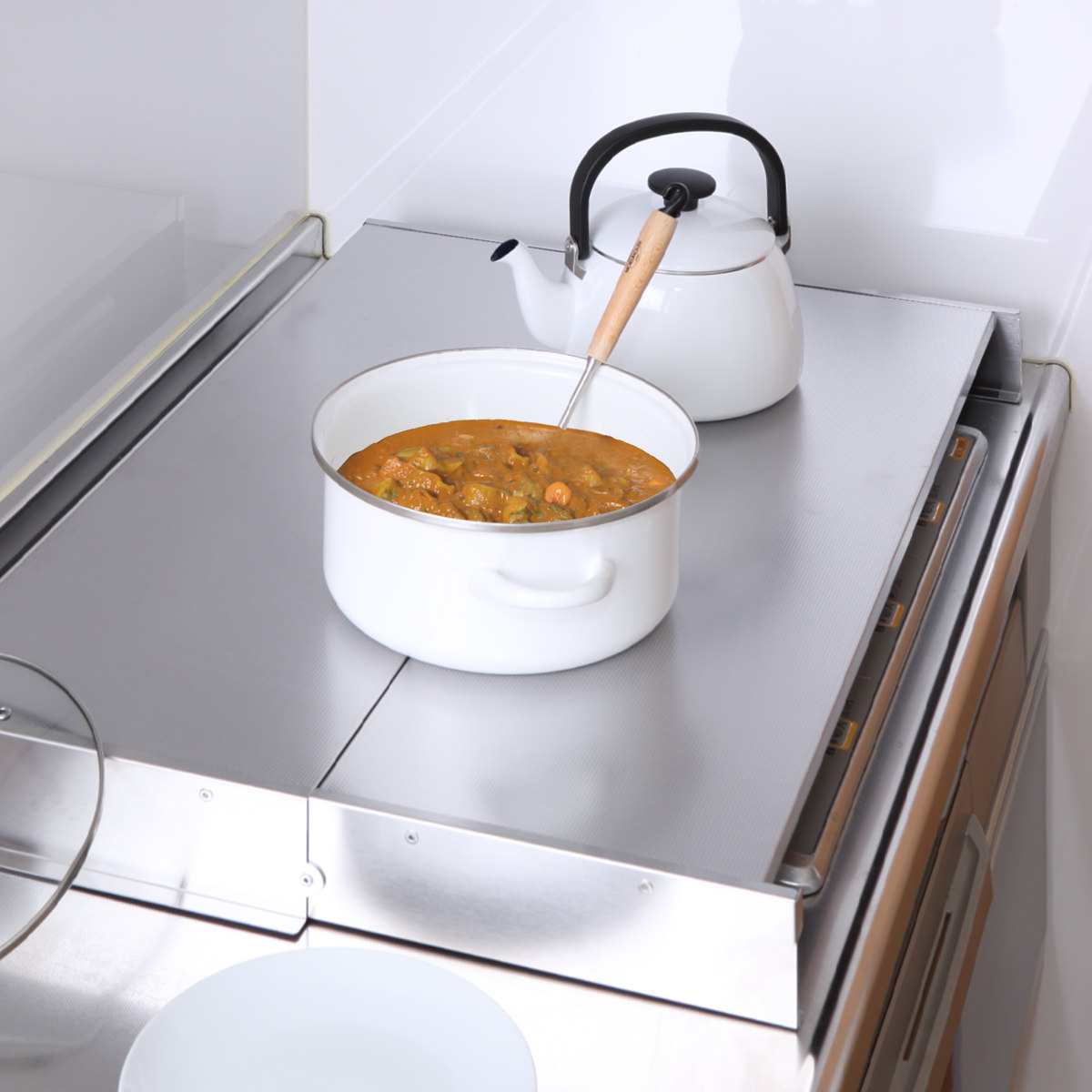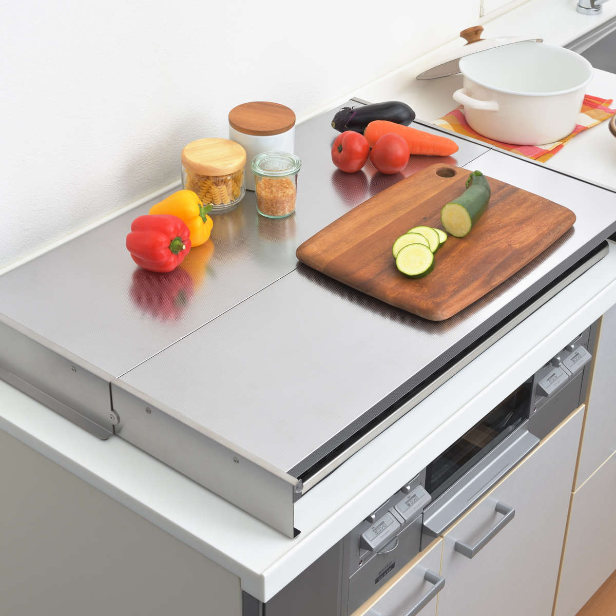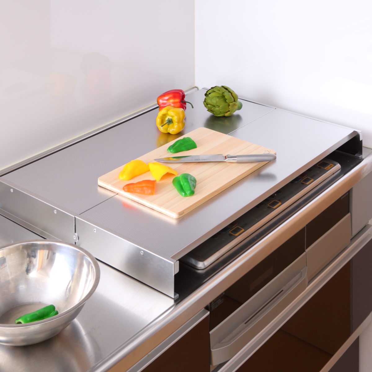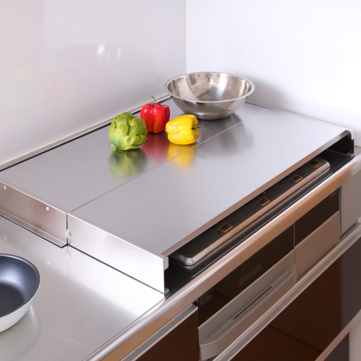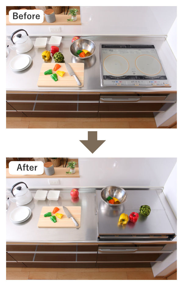 コンロの上を作業スペースとして有効活用できるコンロカバーです。調理道具や食材の一時置きや、まな板を置いて料理の下ごしらえなど便利に使えます。ビルトインのガスコンロ・IHクッキングヒーターのどちらでもお使いいただけます。
