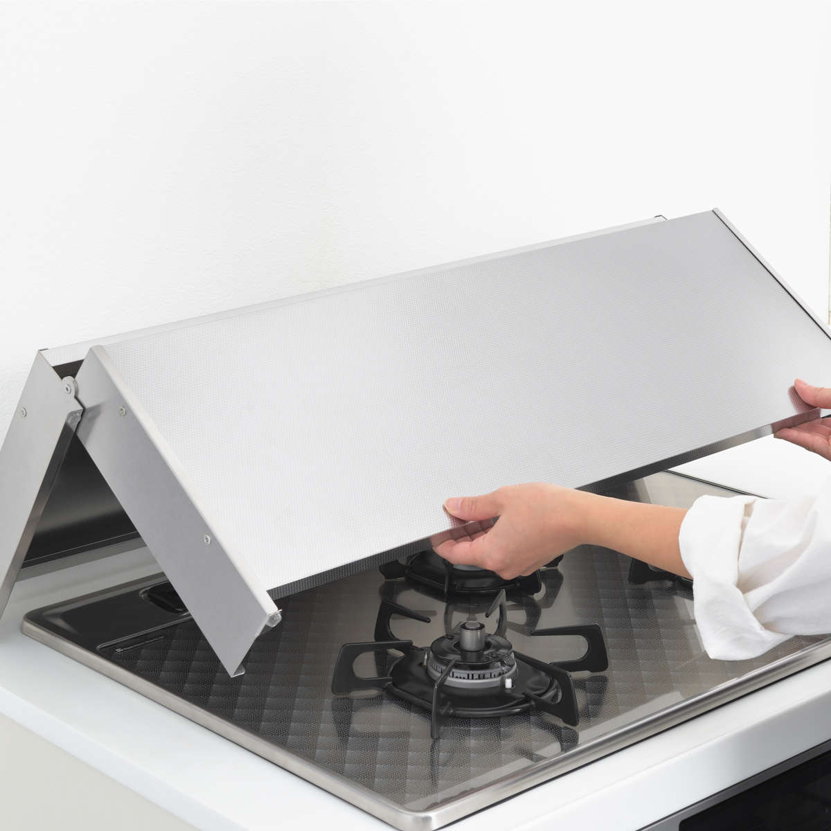 コンロ使用時は折りたたんで立てられます。折りたたむことでグラつくことなく安定するので、コンロ使用中に倒れてくる心配もいりません。圧迫感がないのも折りたたみ式の嬉しいポイントです。