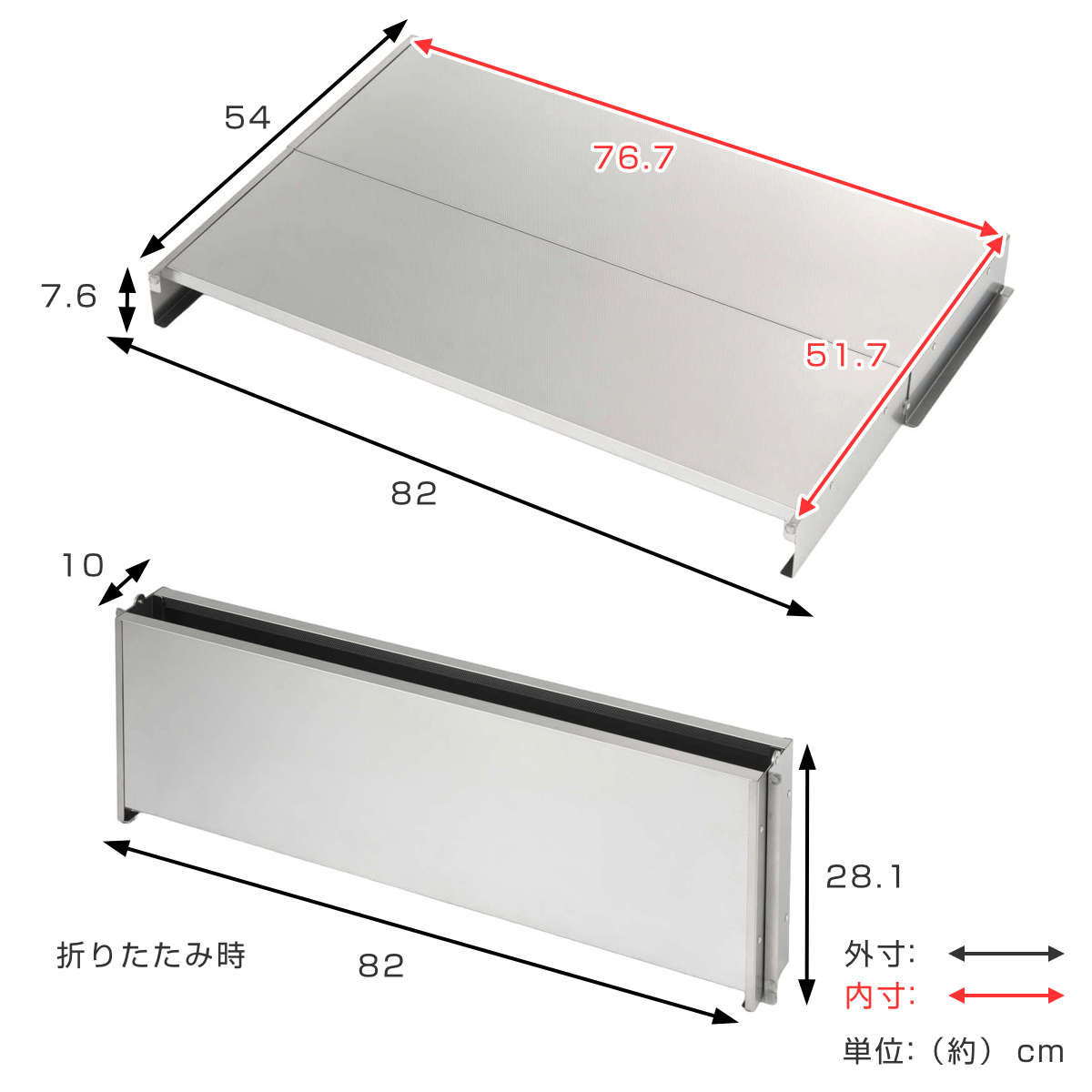 | サイズ | 約 幅82×奥行54×高さ7.6(cm) 折りたたみ時:約 幅82×奥行10×高さ28.1(cm) 天板:約 幅76.7×奥行51.7(cm) |