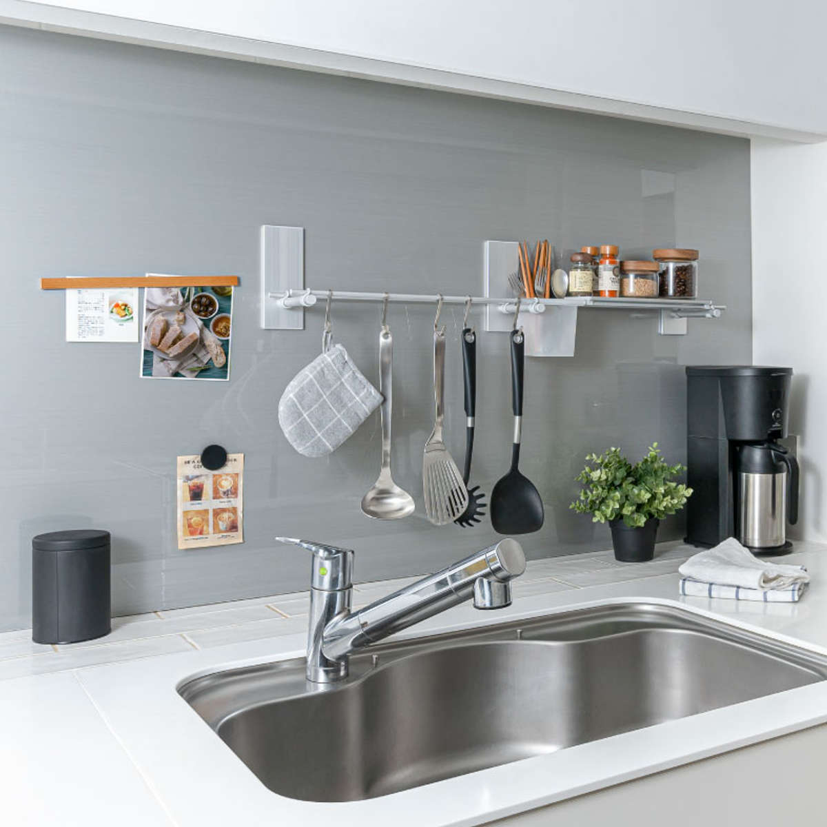同シリーズのマグネット収納アイテムで揃えるとよく使うものをスッキリとまとめられるので、家事の作業性もアップします。