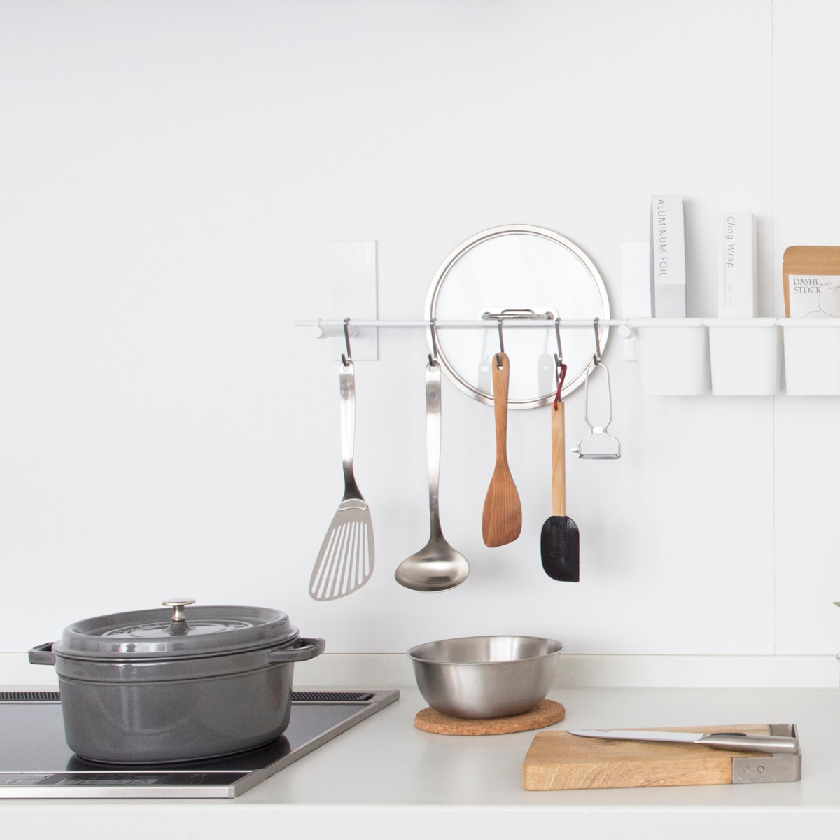ご自宅の壁に取り付けるだけでマグネットがくっつくようになるマグピタボードです。よく使う物をマグネットで壁面に収納すれば、調理スペースをしっかり確保できます。レイアウトも自由自在。手に取りやすい位置に変更ができます。