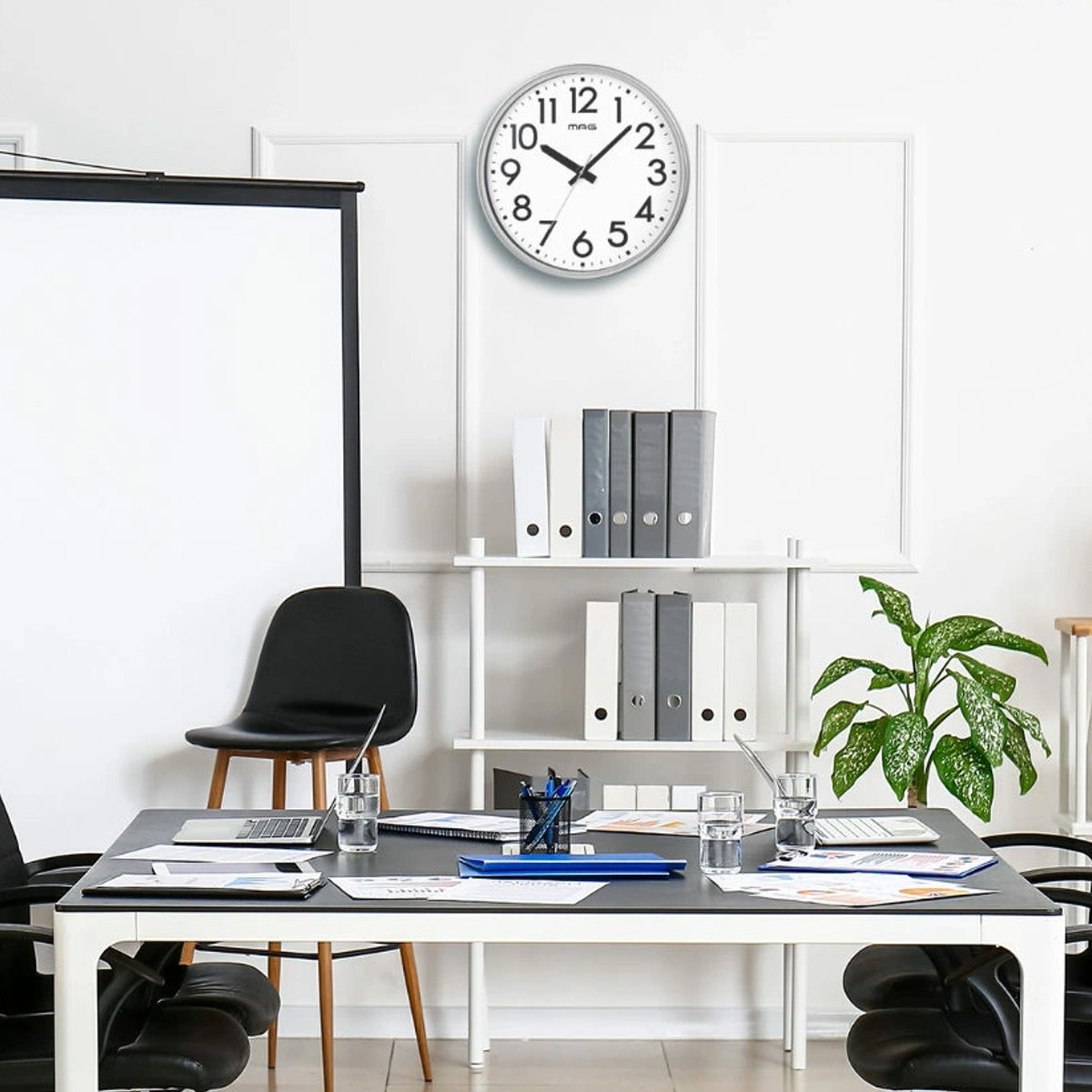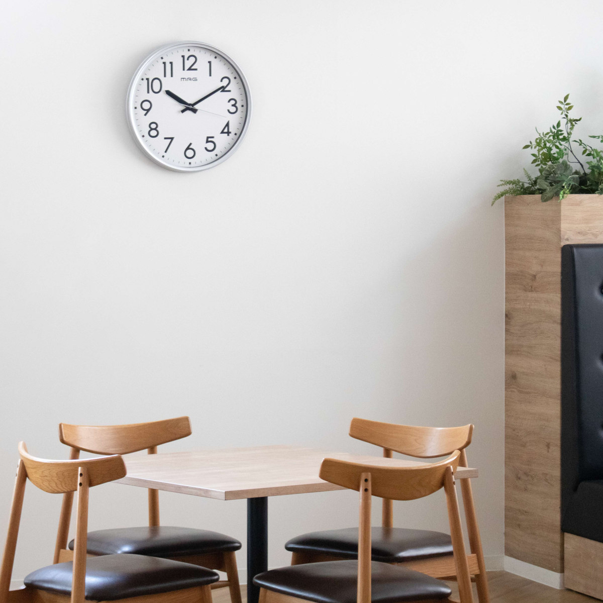直径50cmの業務用サイズの掛け時計です。遠くからでも時刻が確認しやすい大型サイズなのでオフィスや工場、公共施設に最適です。余計な装飾がなくシンプルなデザインなので、どんな空間にも調和し、長く愛用していただけます。