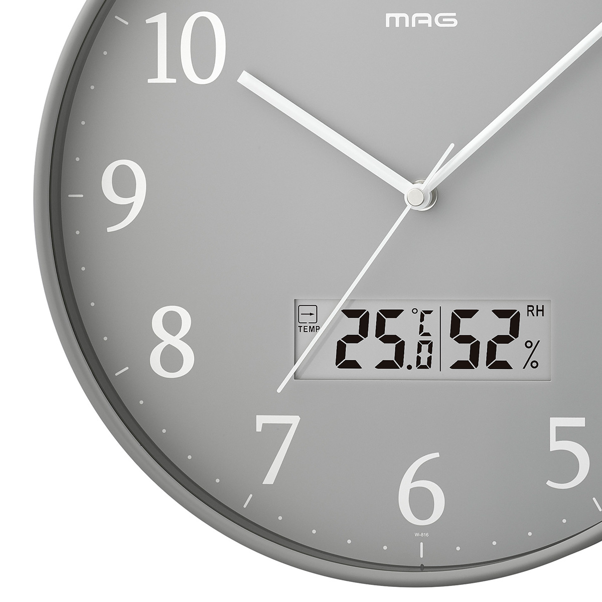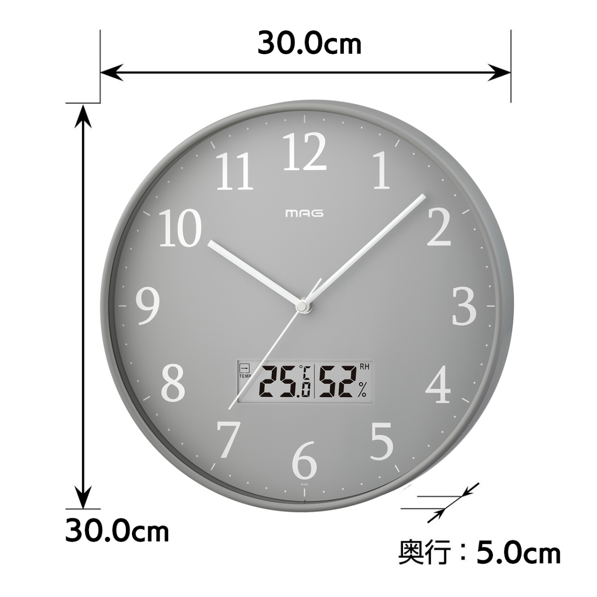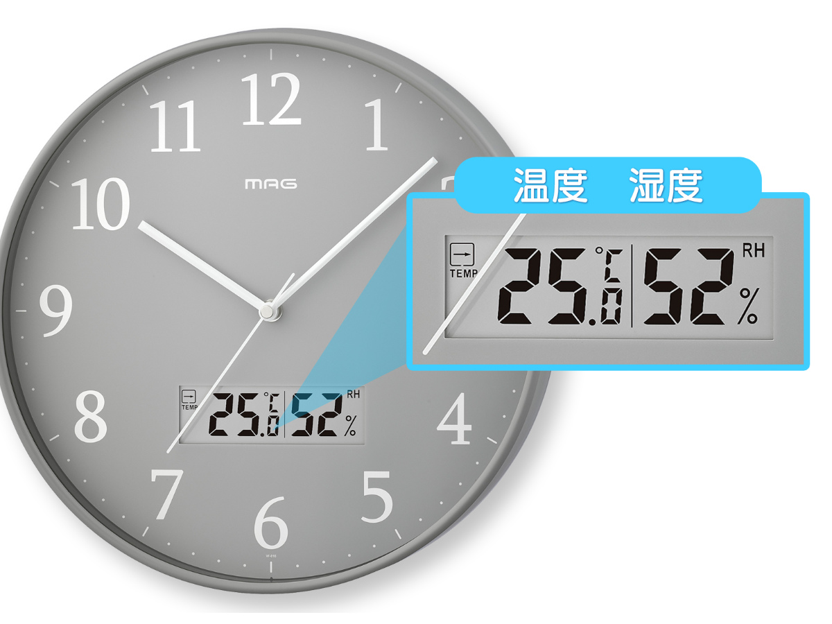 掛け時計 グリージョ MAG 電波時計 ステップ秒針 秒針停止機能付き 温湿度計付き ( マグ ウォールクロック 時刻同期 時計 壁掛け アナログ時計 30cm 温度 湿度 夜間秒針停止 シンプル レトロ おしゃれ 文字盤 グレー )