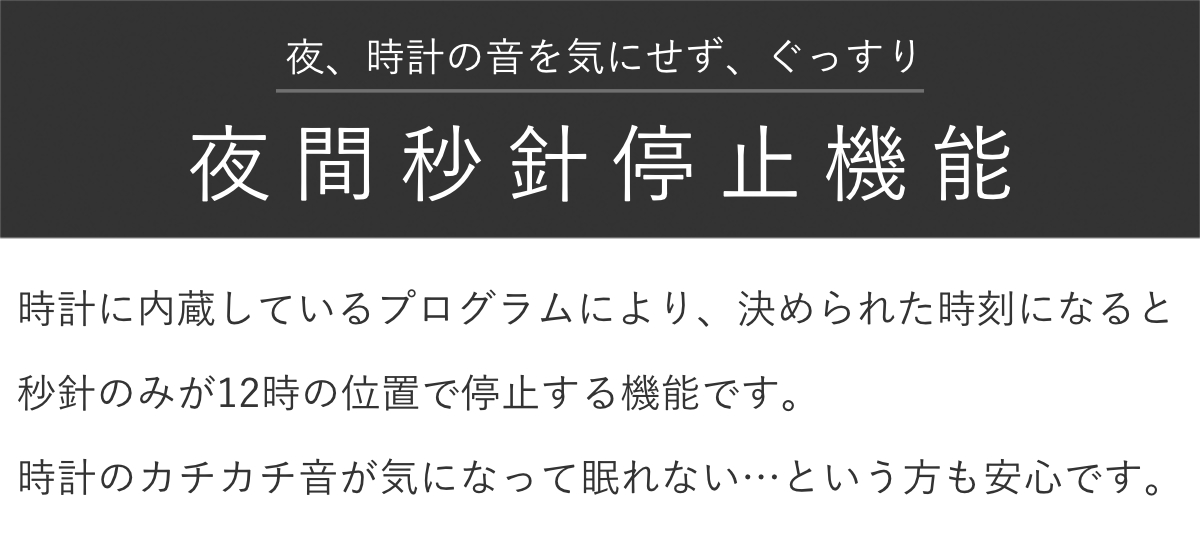 ●夜間秒針停止機能付きなので、夜に眠る際の時計のカチカチ音が気になりません。