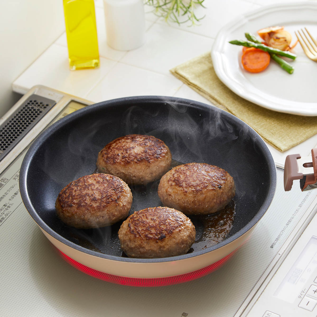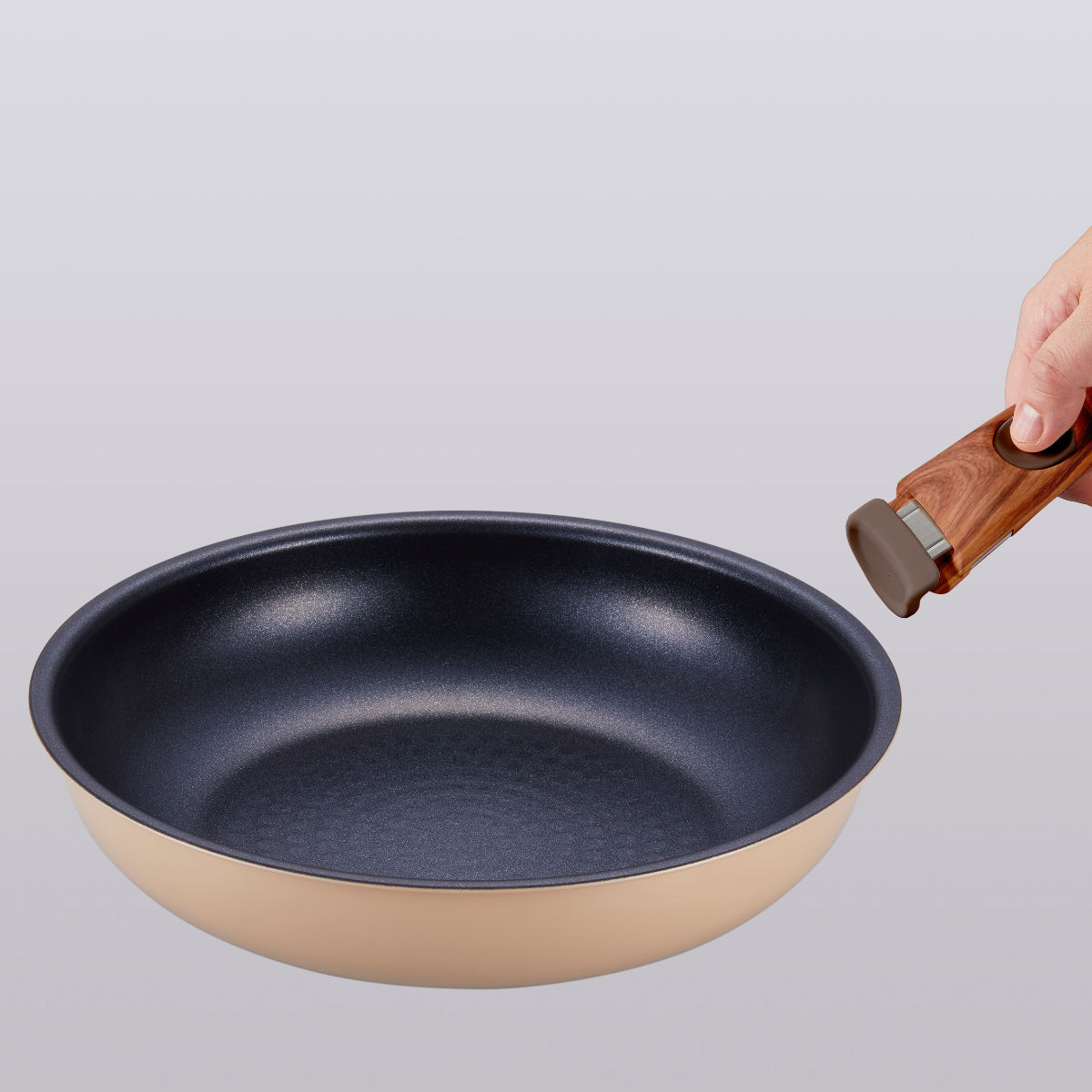 ハンドルが着脱できるフライパンです。2~4人分の調理に便利で、メインから副菜まで活躍する使い勝手の良い万能サイズです。