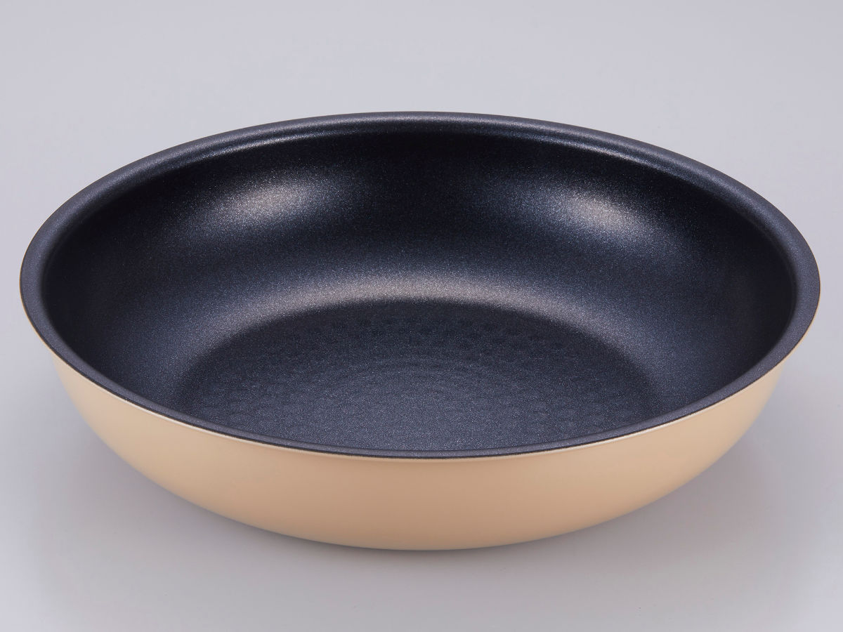 圧縮プレス加工により、内面のふっ素塗膜を均一にならし、表面粗度を細かくすることで、ツヤのあるなめらかな仕上がりを実現しました。一般的なふっ素コートと比べ、食材が付着しにくく、傷つきにくいのが特長です。
