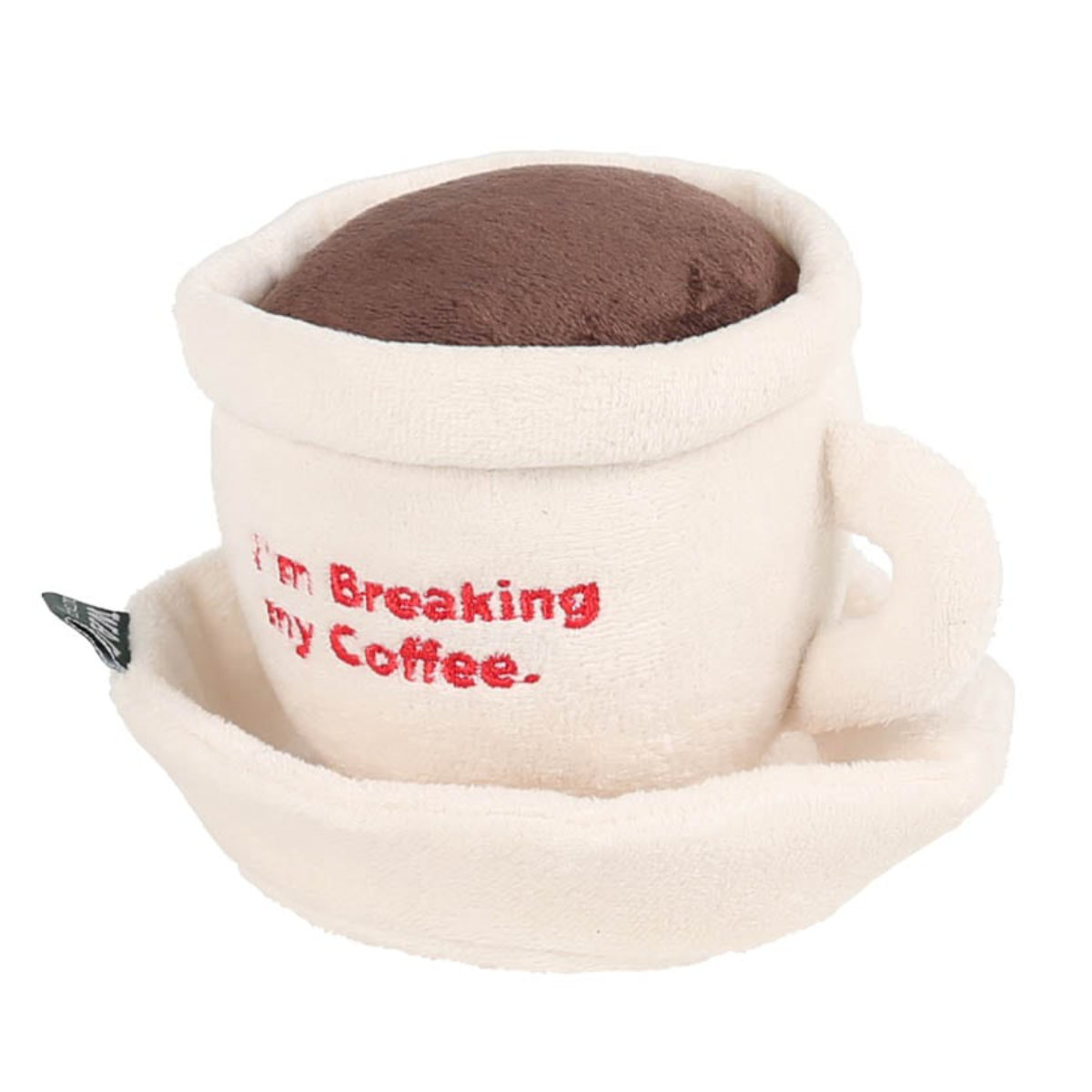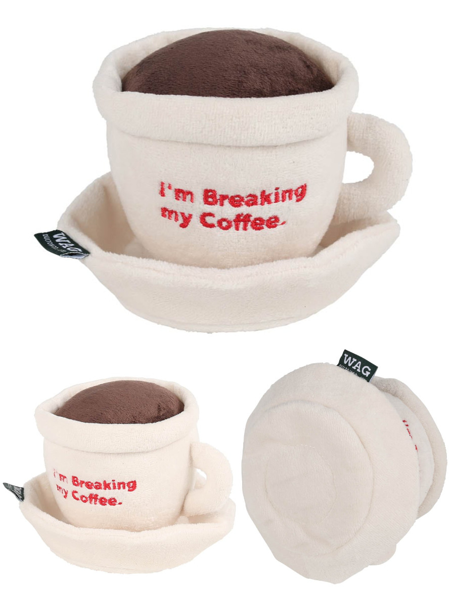 クラシックなカップアンドソーサーのデザインです。「I'm Breaking my Coffee」と刺繍された文字は、「コーヒーブレイク」と「僕は今コーヒーを噛んで壊してるんだ」の二重の掛け言葉になっています。