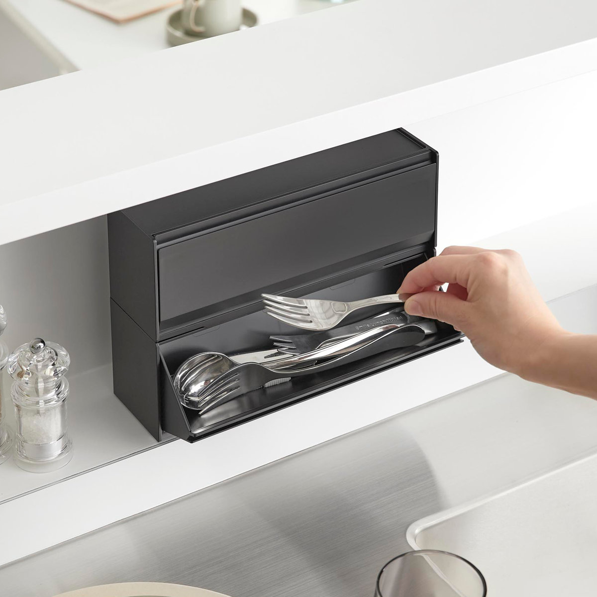 マグネットで簡単に取り付けられて、使いたい時にサッと取り出せる便利なカトラリーケースです。シンプルでスタイリッシュなデザインなので場所を選ばずスマートに設置できます。