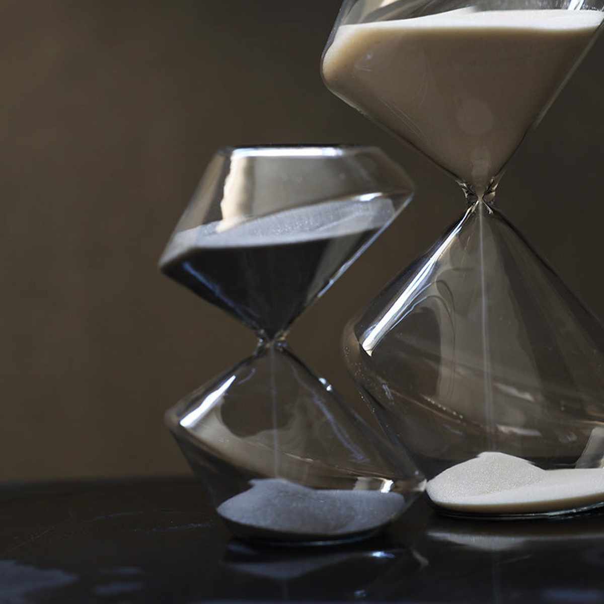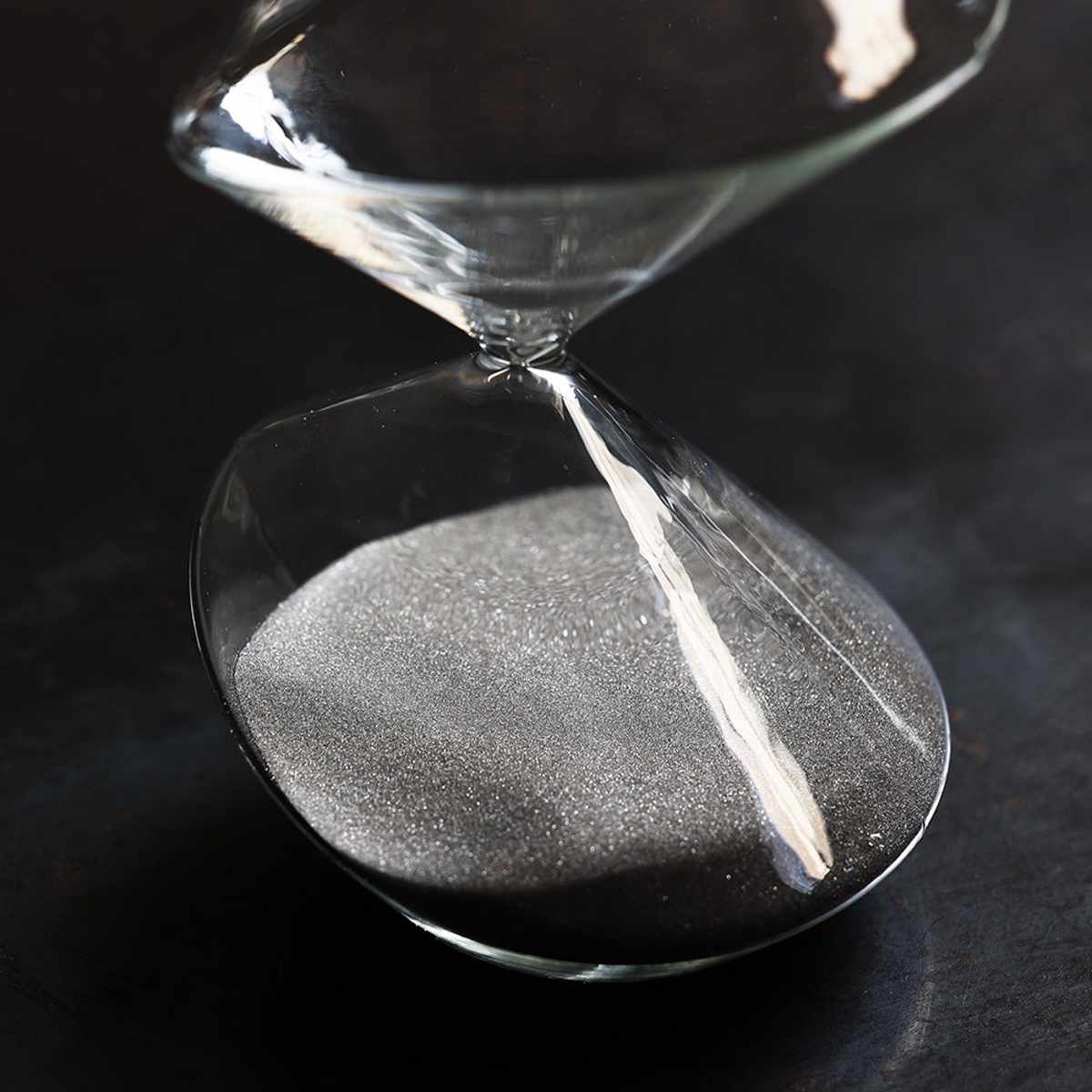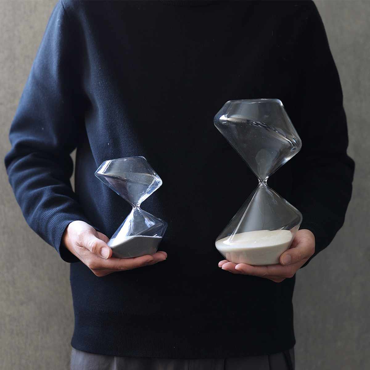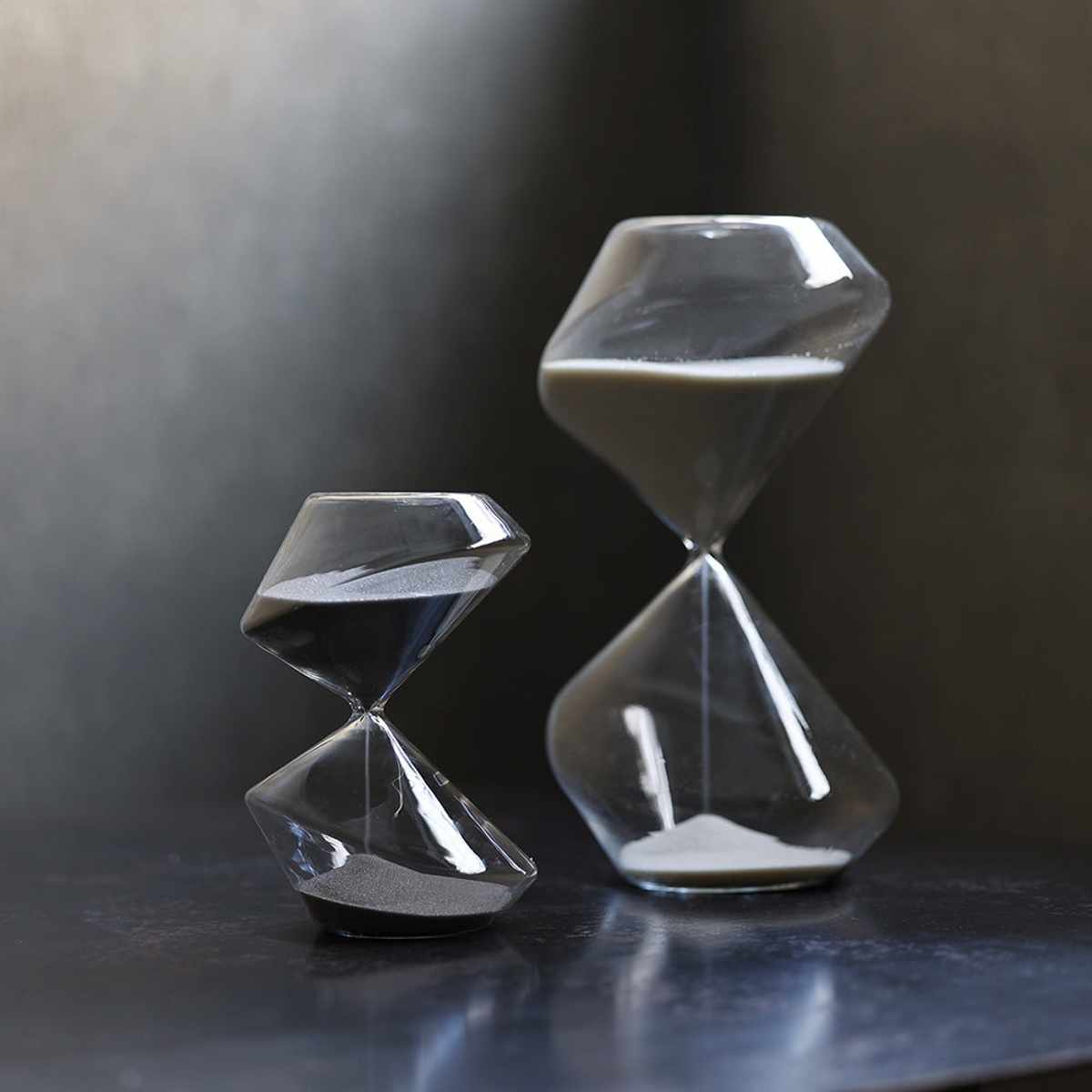 従来のドロップ型の砂時計とは一線を画す、彫刻的なデザインが特徴です。オブジェとして飾るだけでも様になります。
