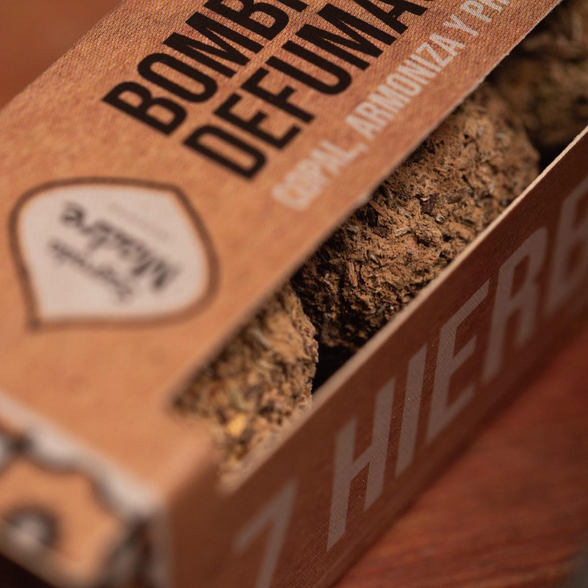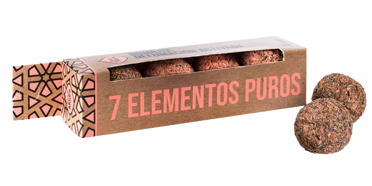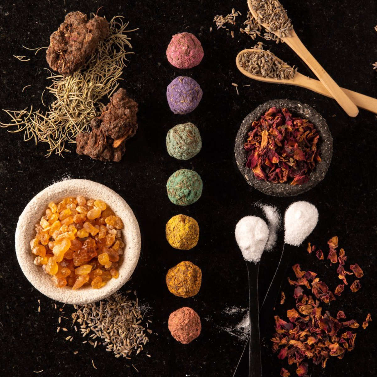 7つのエッセンス(エストラケ、ムスク、ベンジャミン、フランキンセンス、ミルラ、ローズマリー、ルーダ) /ハーブ/樹脂/杉/廃棄フルーツ/木炭/天然結合剤/塩