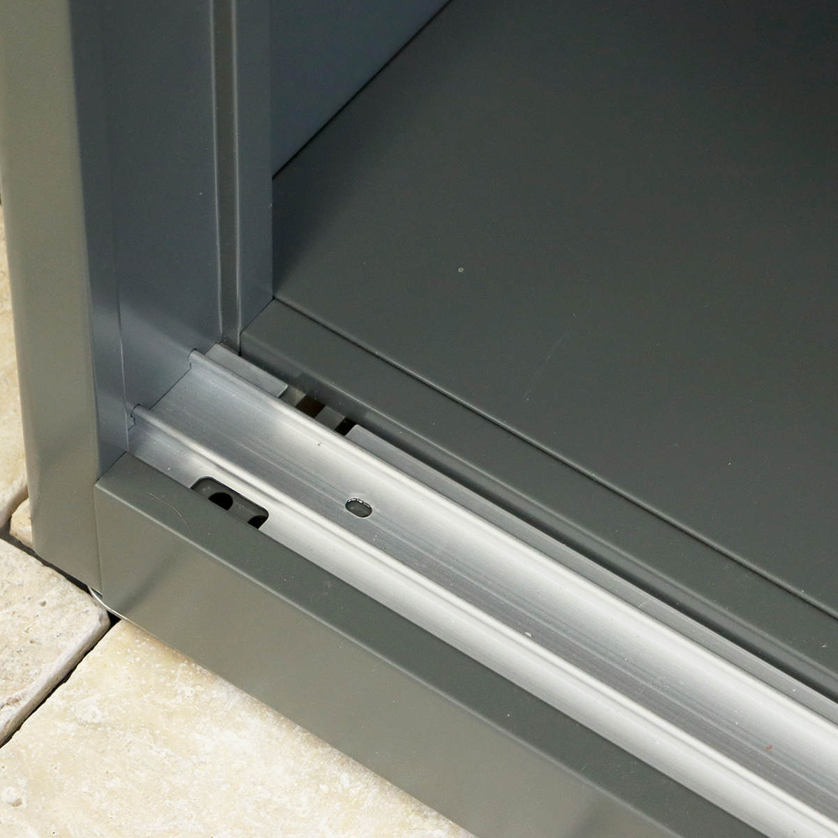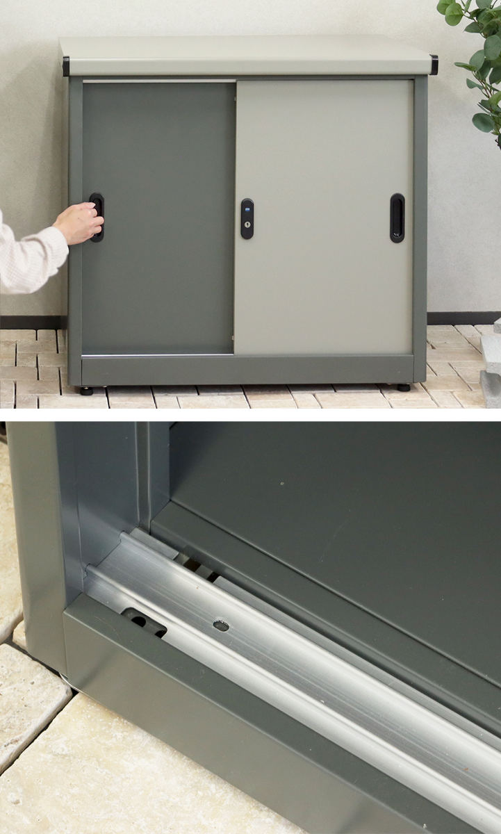扉はスライドレールタイプでスムーズに開閉できます。レールの隅には水抜き穴があり、水や小さなゴミが入った時には、ここから地面に落せるのでお手入れが簡単です。
