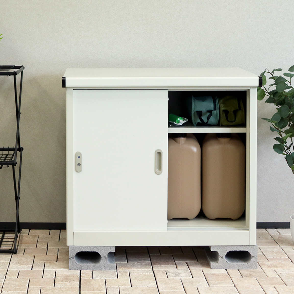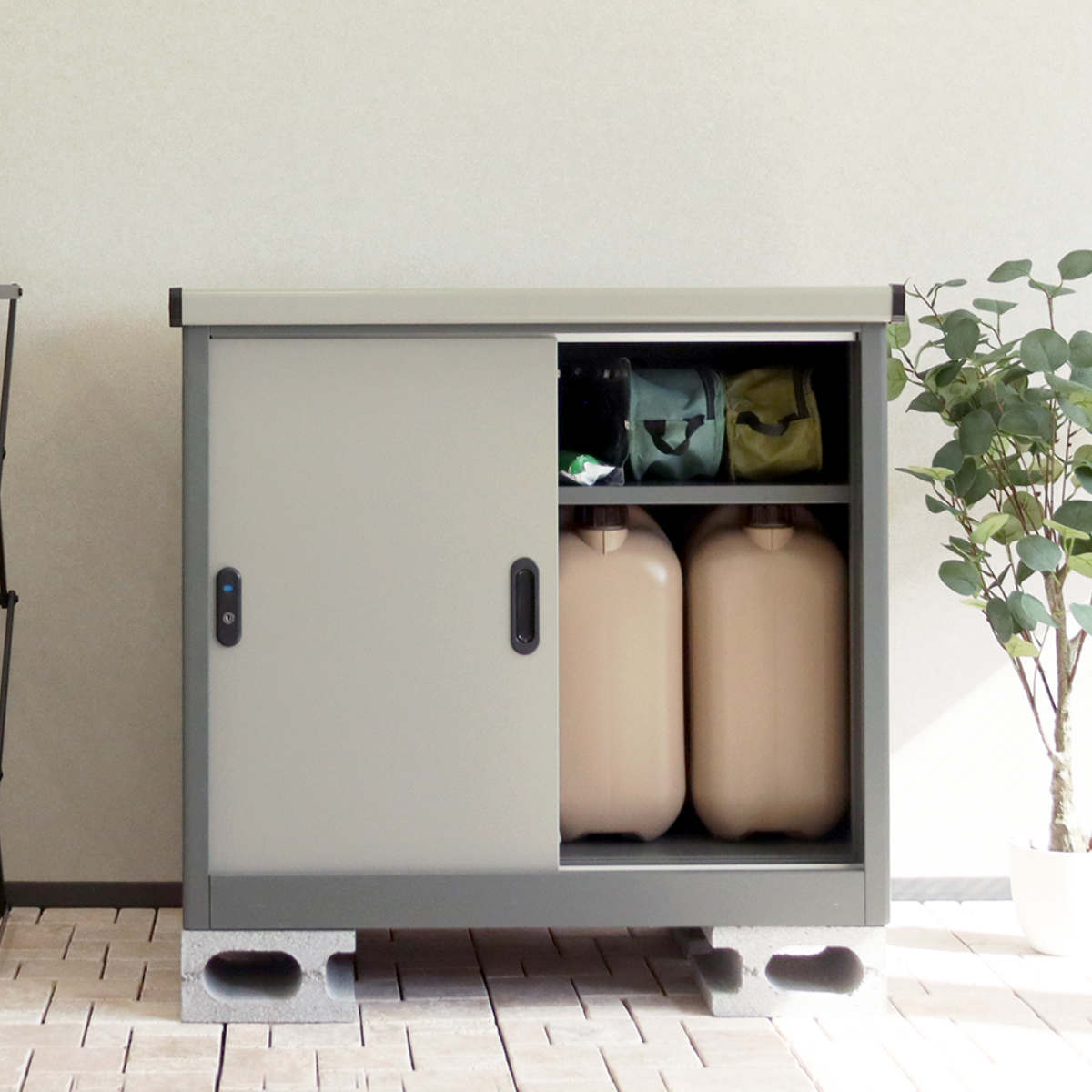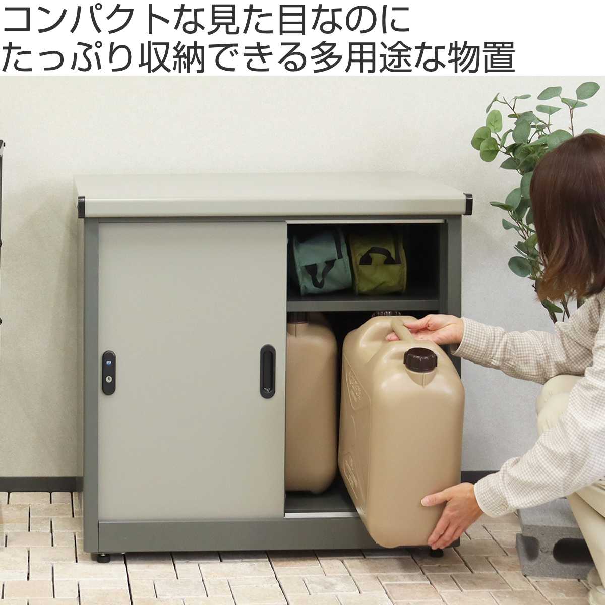 コンパクトな見た目ですが、たっぷり入る物置です。灯油缶やガーデン用品、防災グッズなどすっきり収納できます。