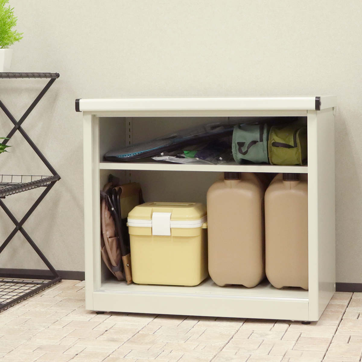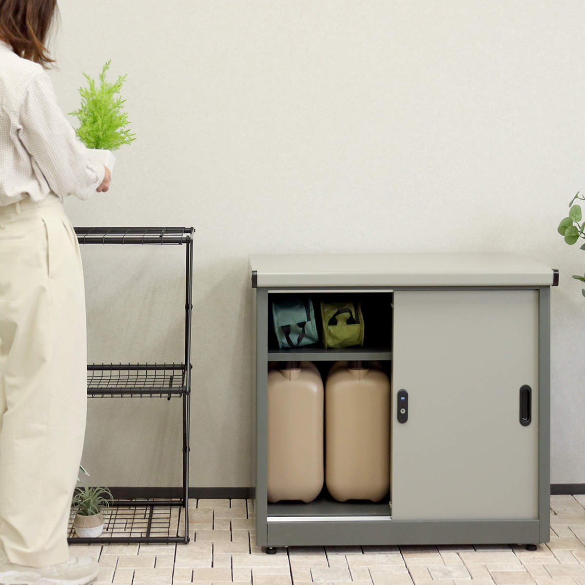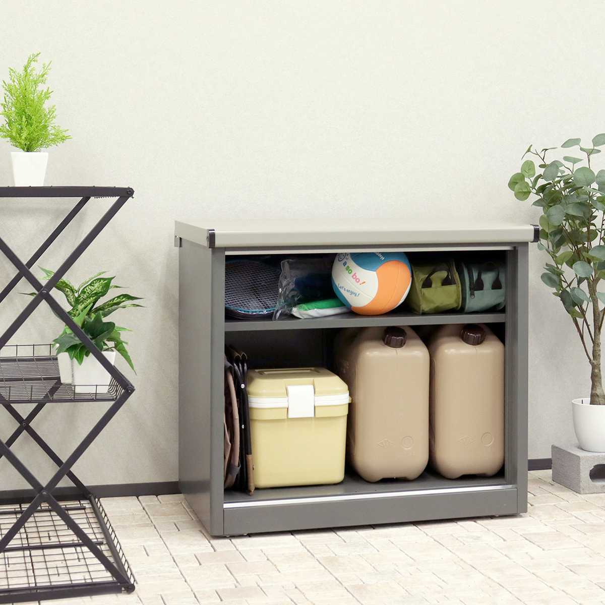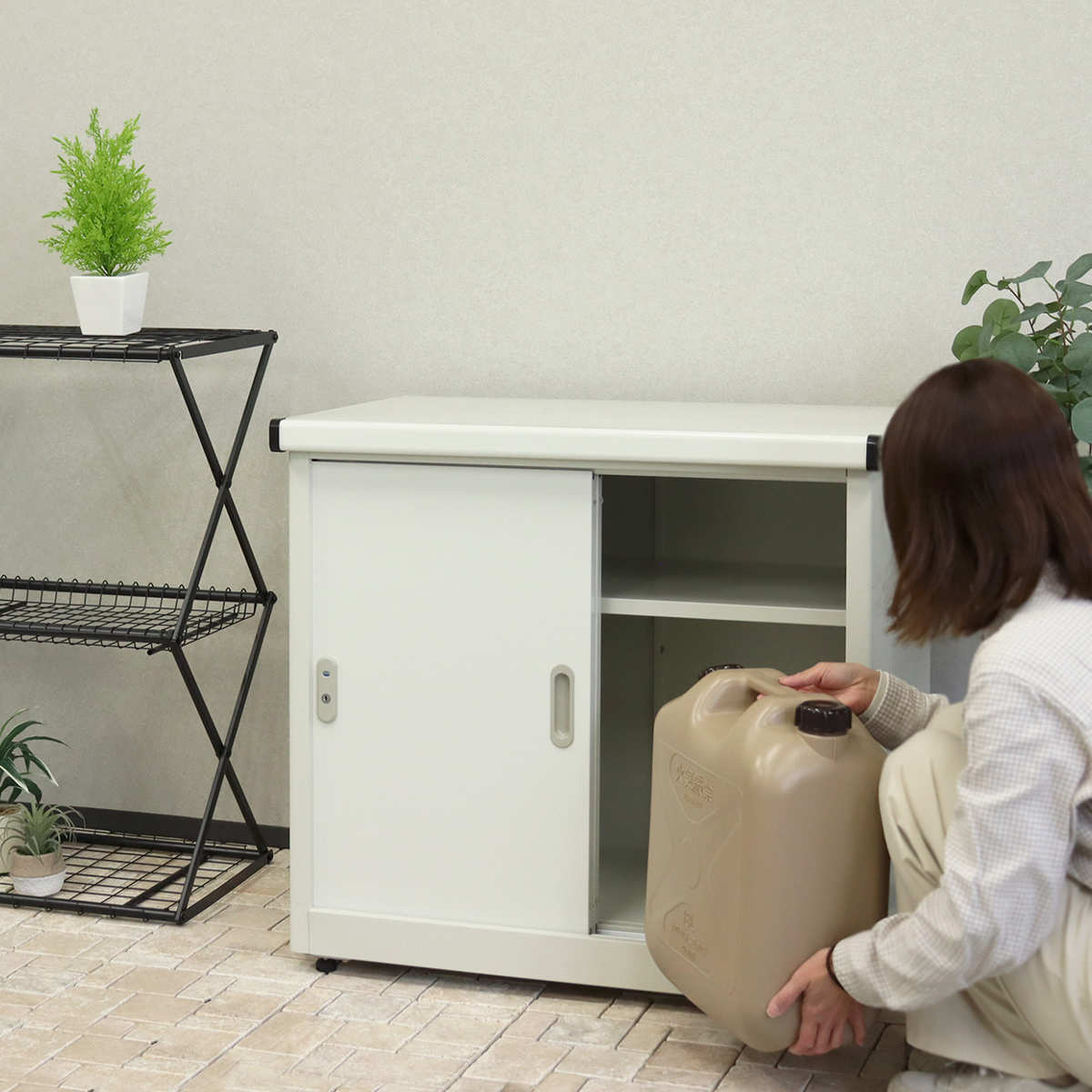 コンパクトな見た目ですが、たっぷり入る物置です。灯油缶やガーデン用品、防災グッズなどすっきり収納できます。