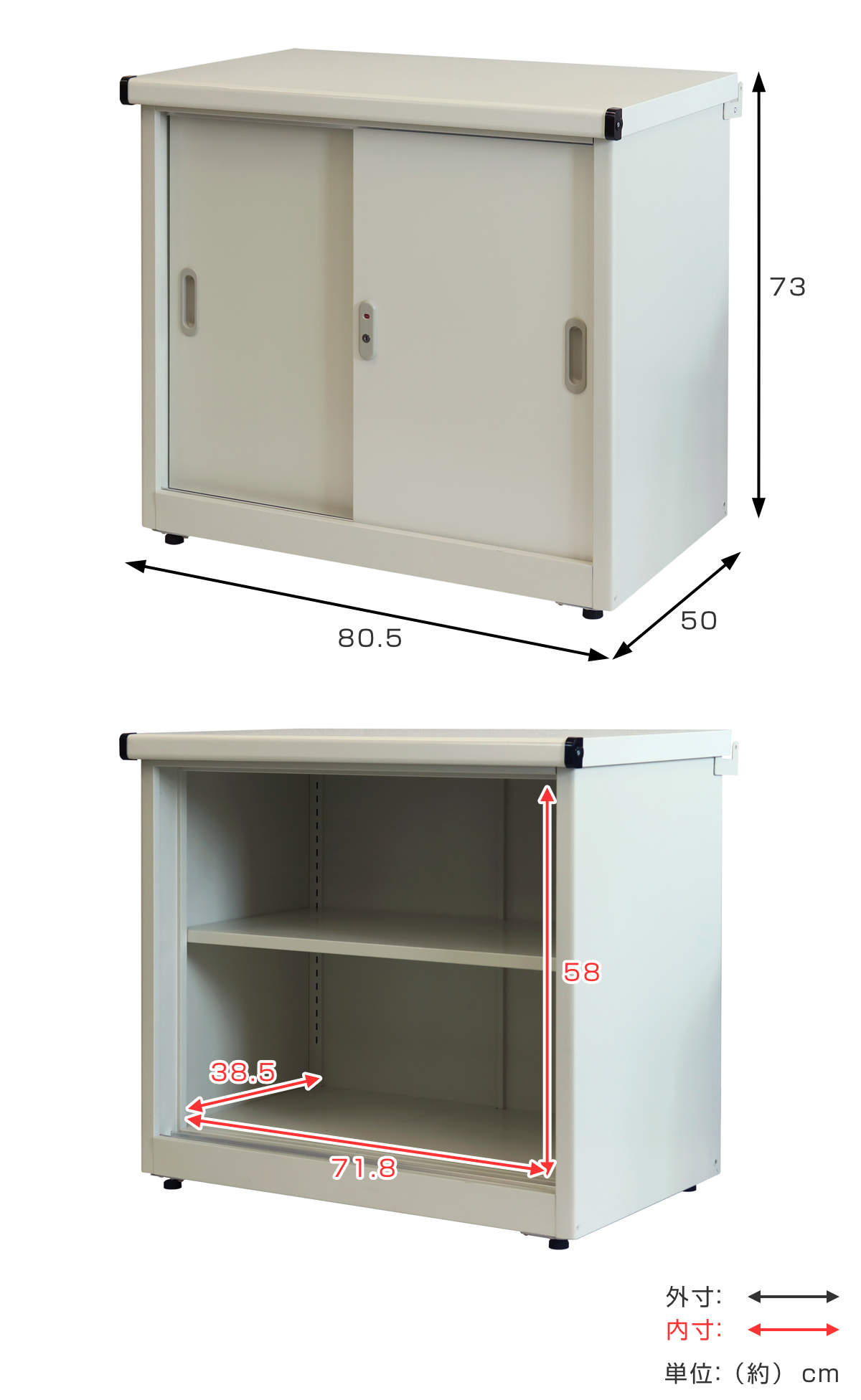 | サイズ | 外寸:約 幅80.5×奥行50×高さ73(cm) 内寸:約 幅71.8×奥行38.5×高さ58(cm) |
