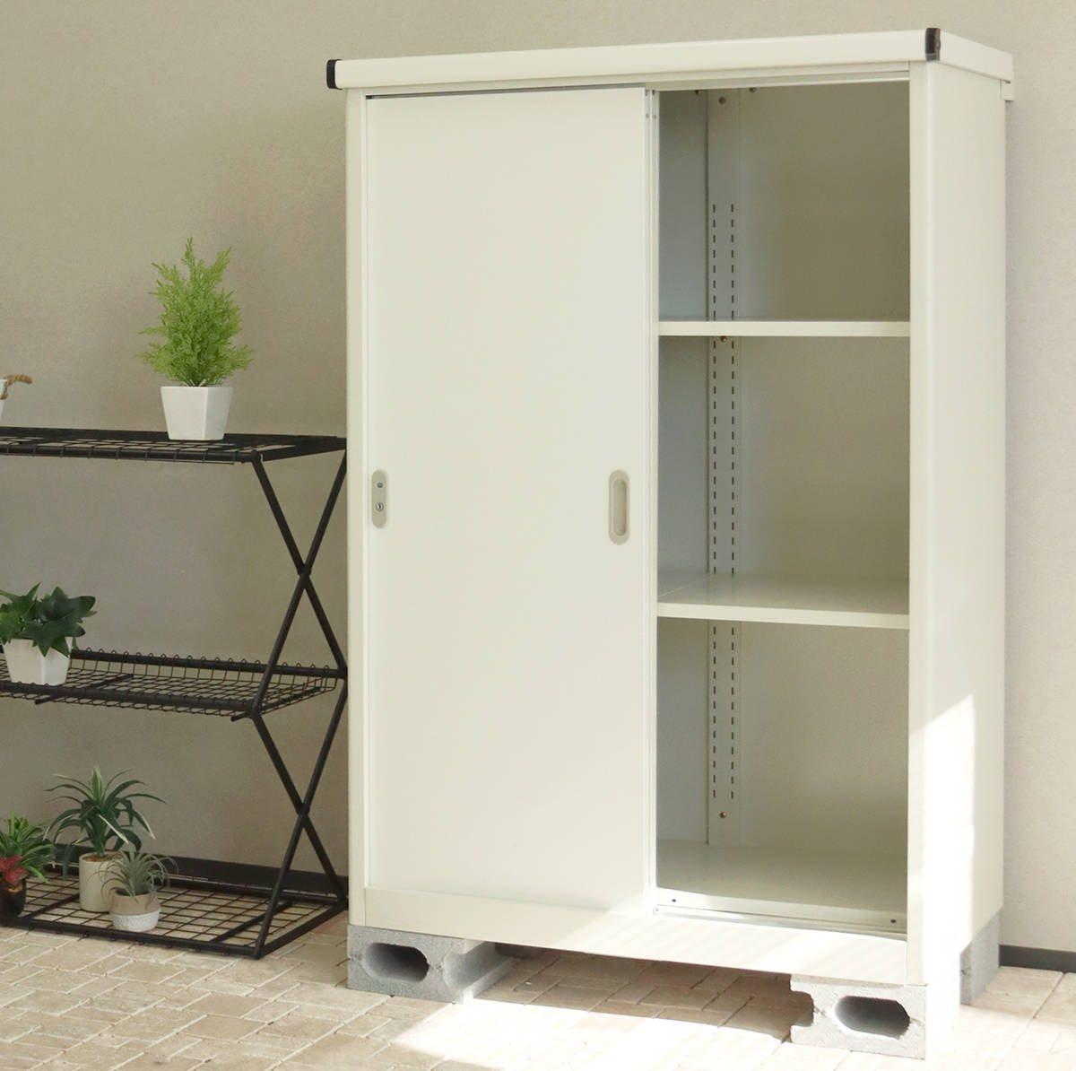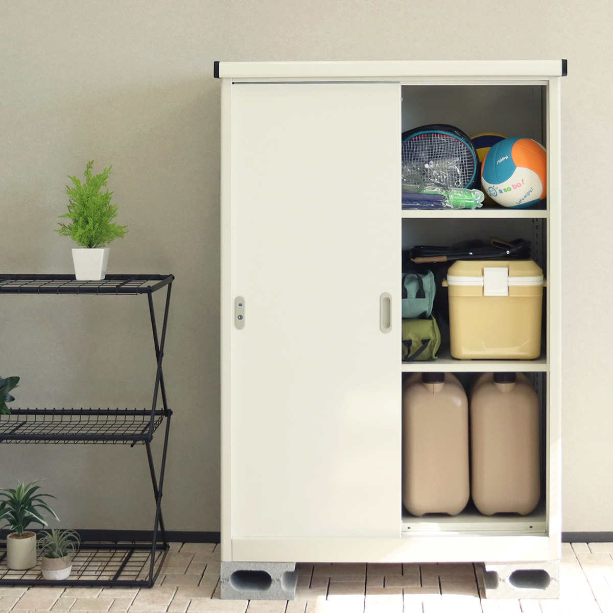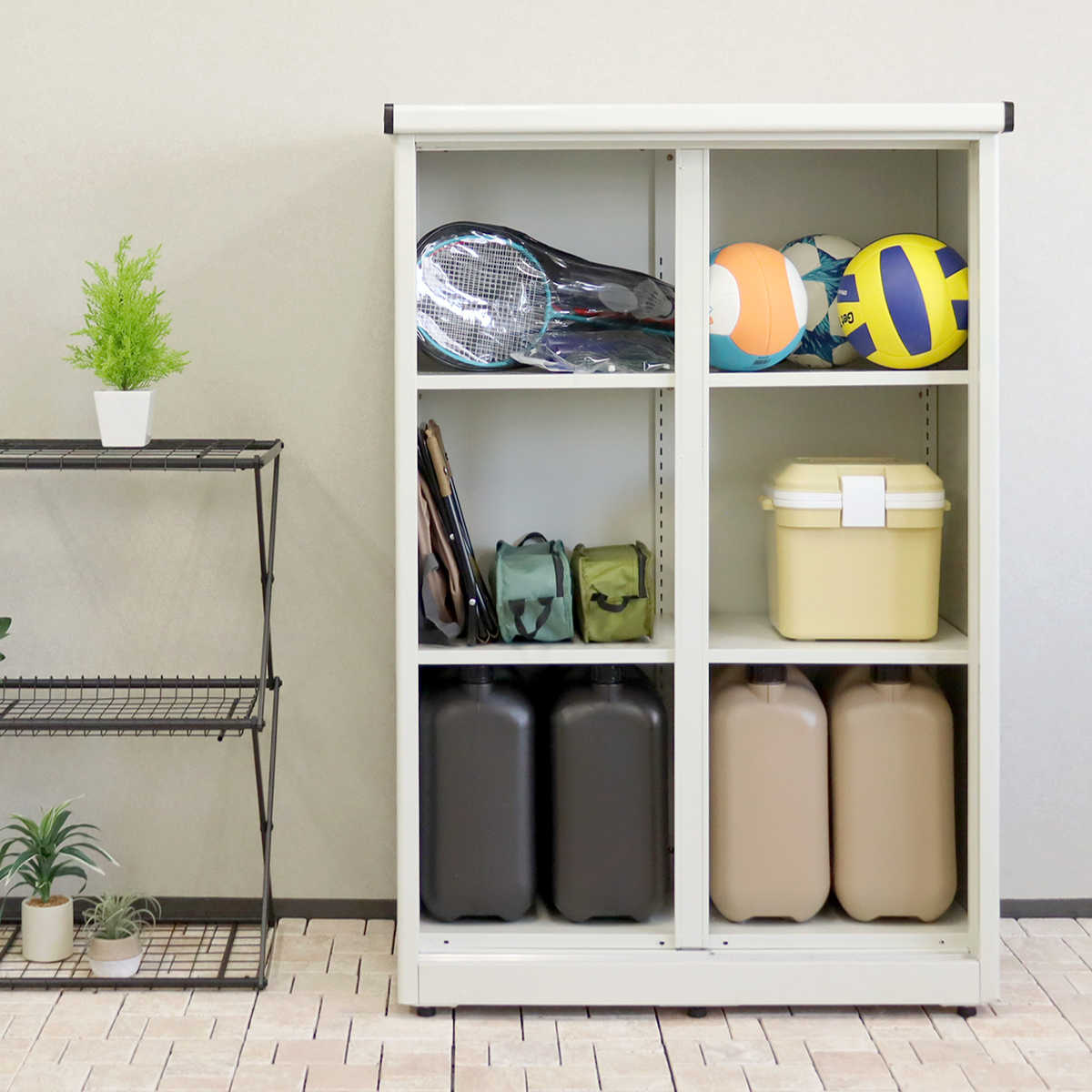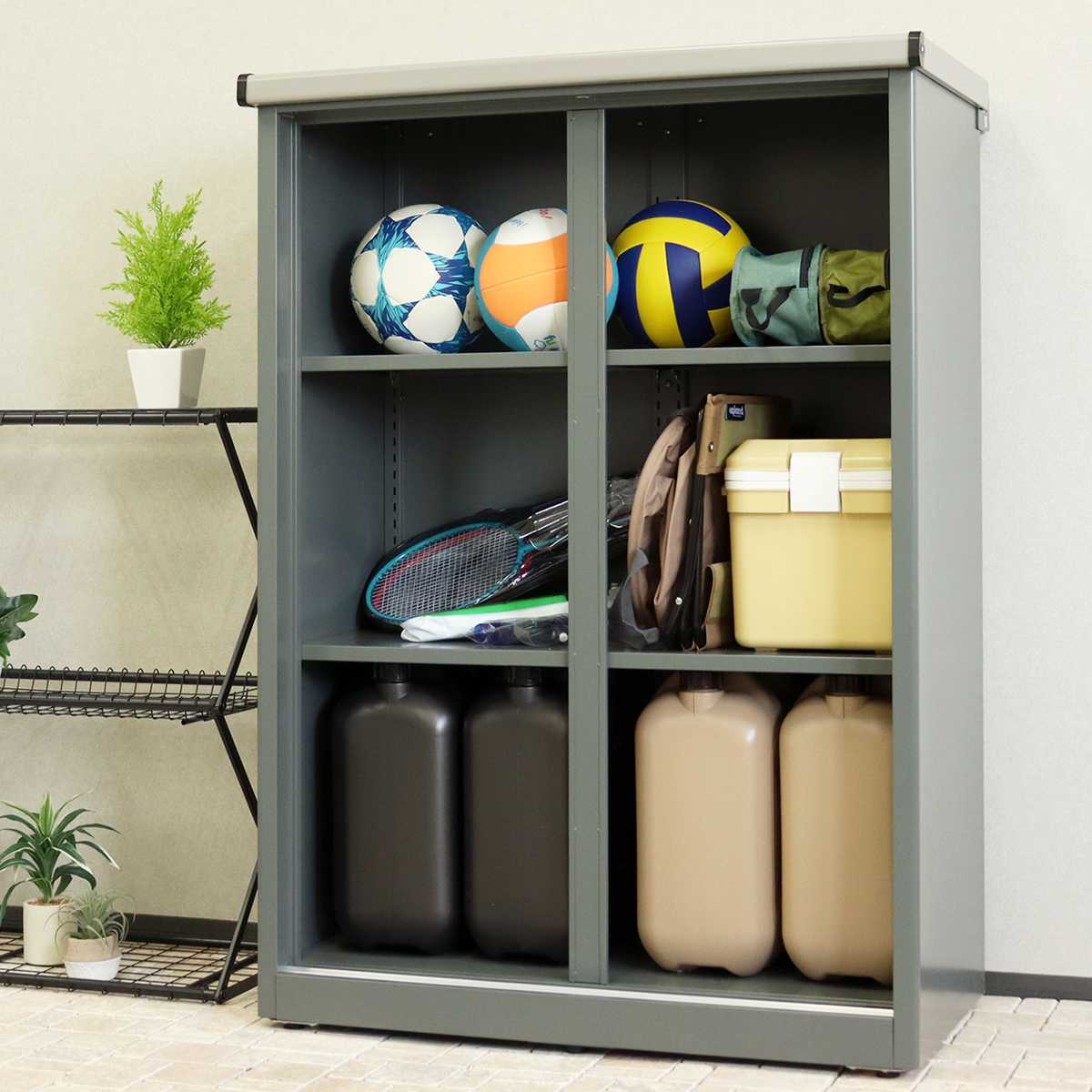 縦長タイプの物置です。中央に仕切りがあり、左右で分割して棚板の高さを調整できます。大きなゴルフバッグやベビーカー、お子様の遊具などすっきり収納できます。