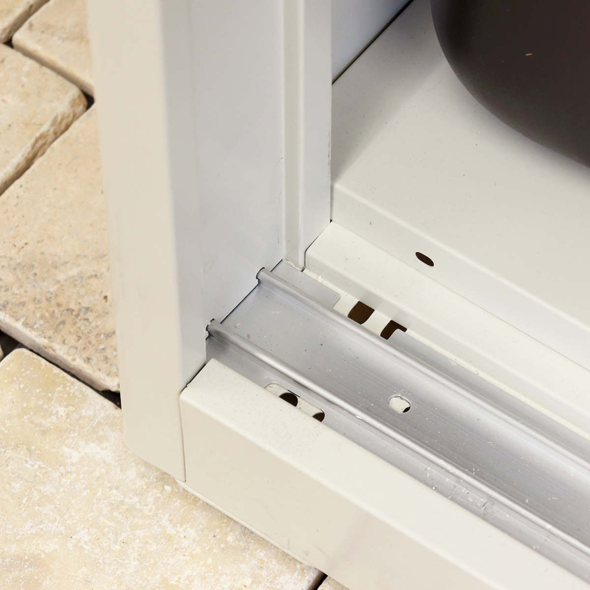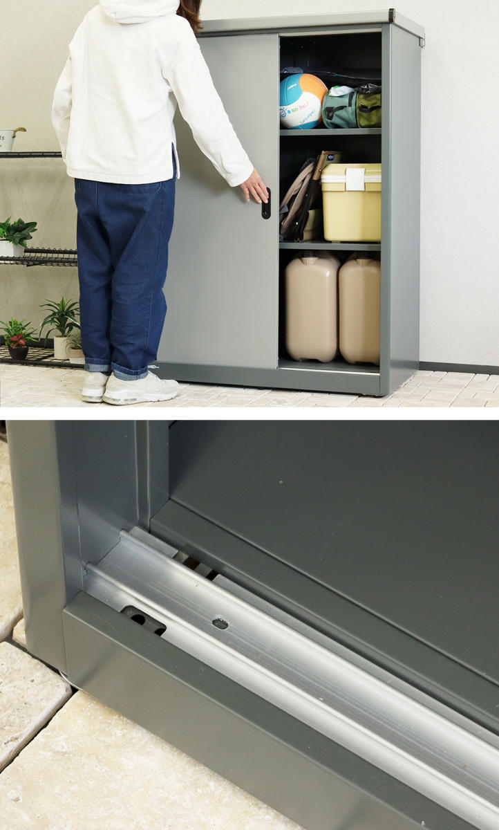 扉はスライドレールタイプでスムーズに開閉できます。レールの隅には水抜き穴があり、水や小さなゴミが入った時には、ここから地面に落せるのでお手入れが簡単です。