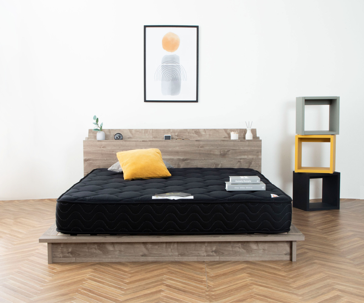 アブラヤシの廃材でできた再生ボードで作られたローベッドです。高級感漂うリアルな木目調のシートが、お部屋に温もりを演出します。表面をマットに仕上げた、モダンで洗練されたデザインは、飽きることなく長くお使いいただけます。