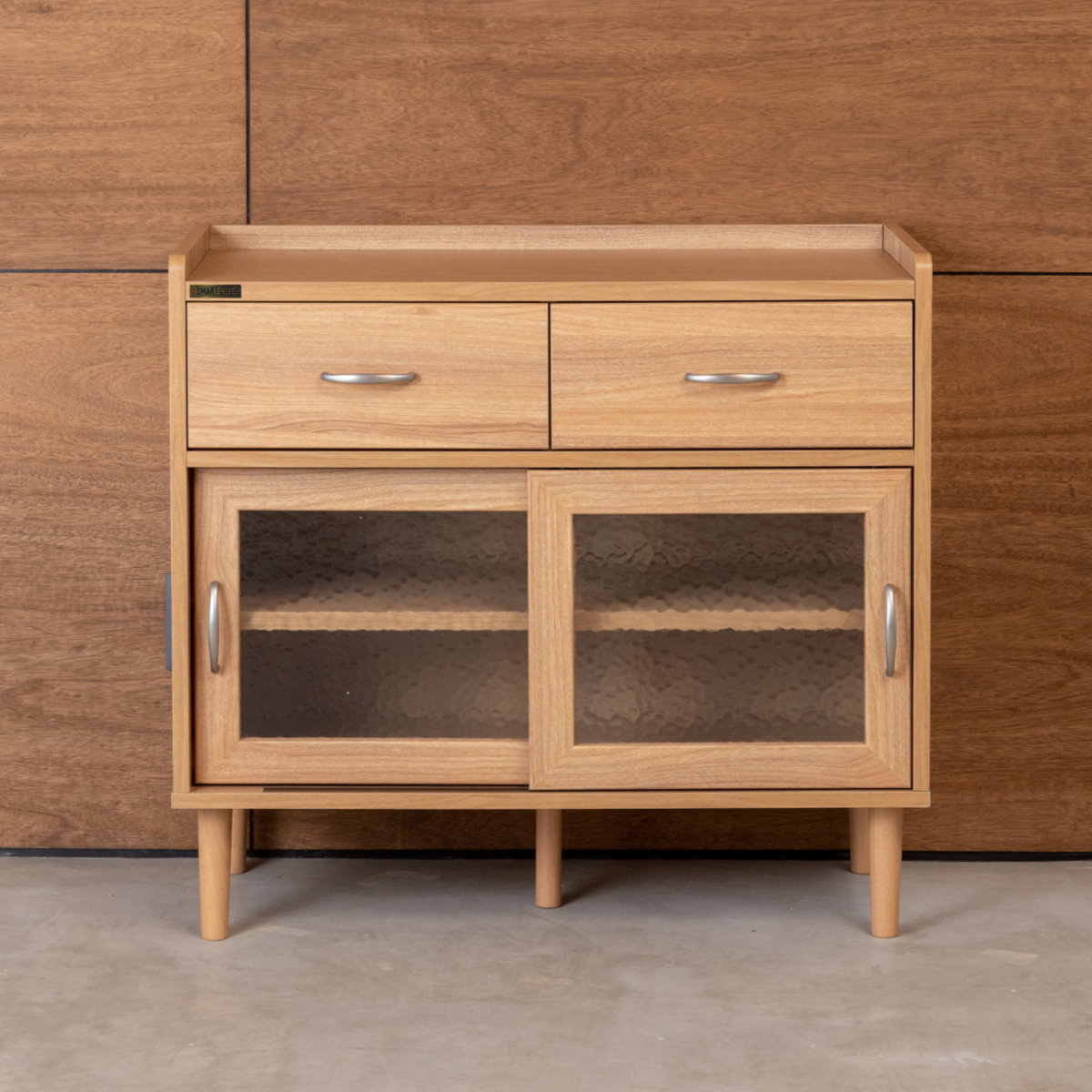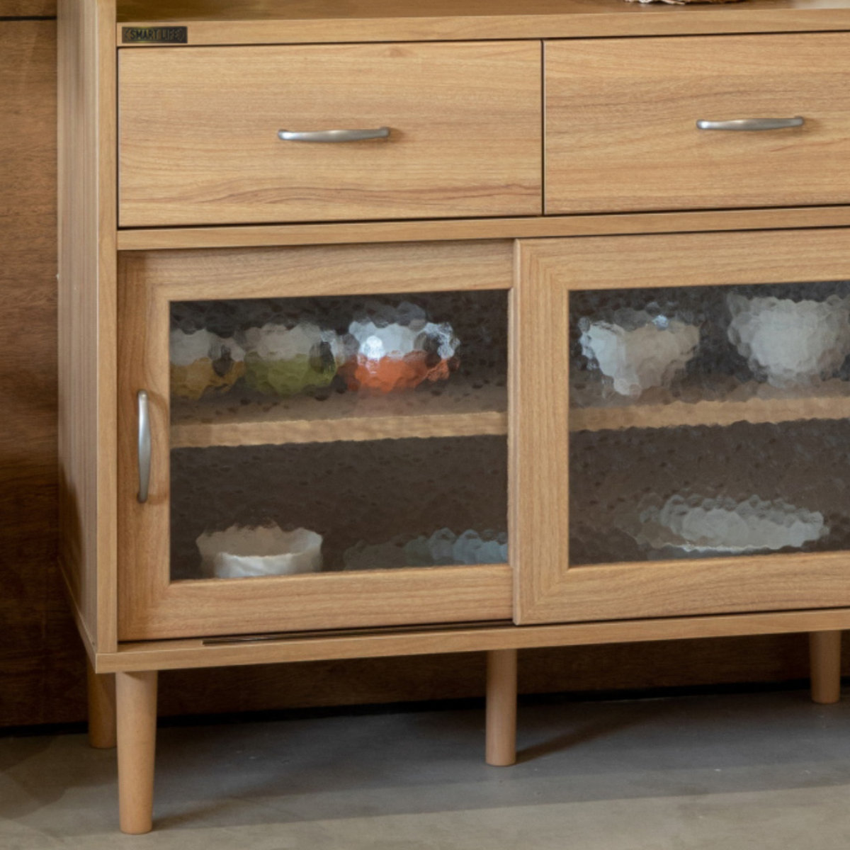 モザイクガラスと丸みのある持ち手がアクセントのガラス扉です。懐かしさを感じさせるモザイクガラスが扉内をぼかすので生活感を隠してスッキリと収納して頂けます。