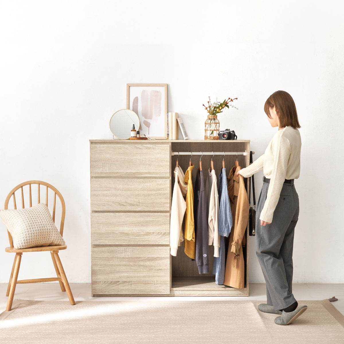 大きな引出しとハンガーポールが付いたハンガーラックです。「たたむ×掛ける」がこれ1つで完結し、たくさんのお洋服や小物をまとめて収納することができます。無駄を省いたシンプルなデザインで、空間にそっと馴染みます。