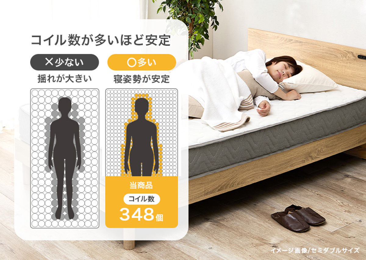 | 材質 | 主材:ポケットコイル(コイル数:348) 張地:ポリエステル |