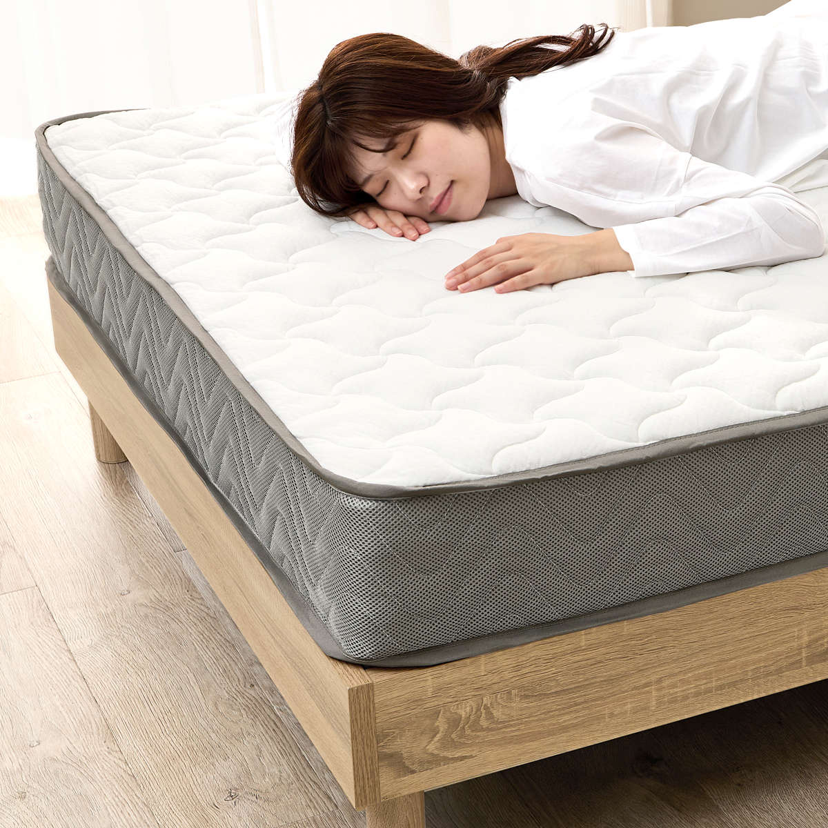 表面には高級マットレスに使用されるニット生地を採用しています。伸縮性に優れ、寝返りの際も身体に優しくフィットします。側面は全てメッシュ素材です。マットレス内に溜まった寝汗などの湿気を放出しやすくし、快適で清潔な状態をキープします。