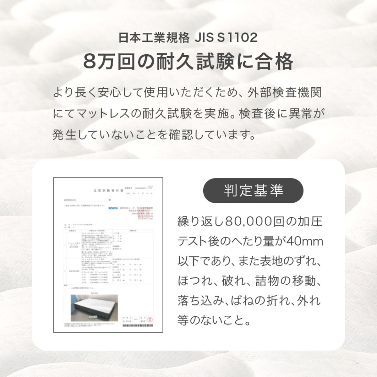 より長く安心して使用していただくため、外部検査機関にてマットレスの耐久試験を実施しています。検査後に異常が発生しない事を確認しています。