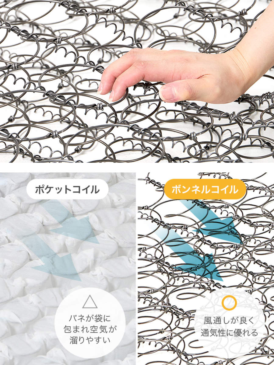通気性が良く高湿度の日本の気候に最適なボンネルコイルのマットレスです。ボンネルコイルは、コイル同士が連結した構造により身体全体を面で支えます。適度に硬い優れた弾力性で、安定感のある寝心地を実現します。