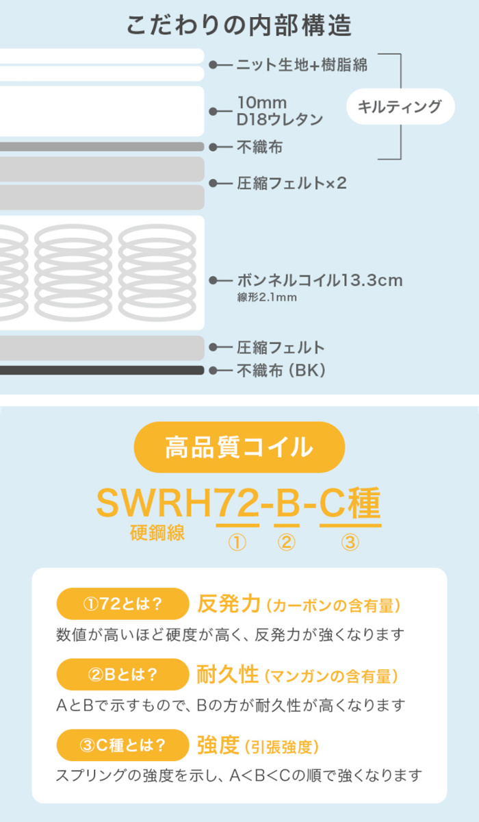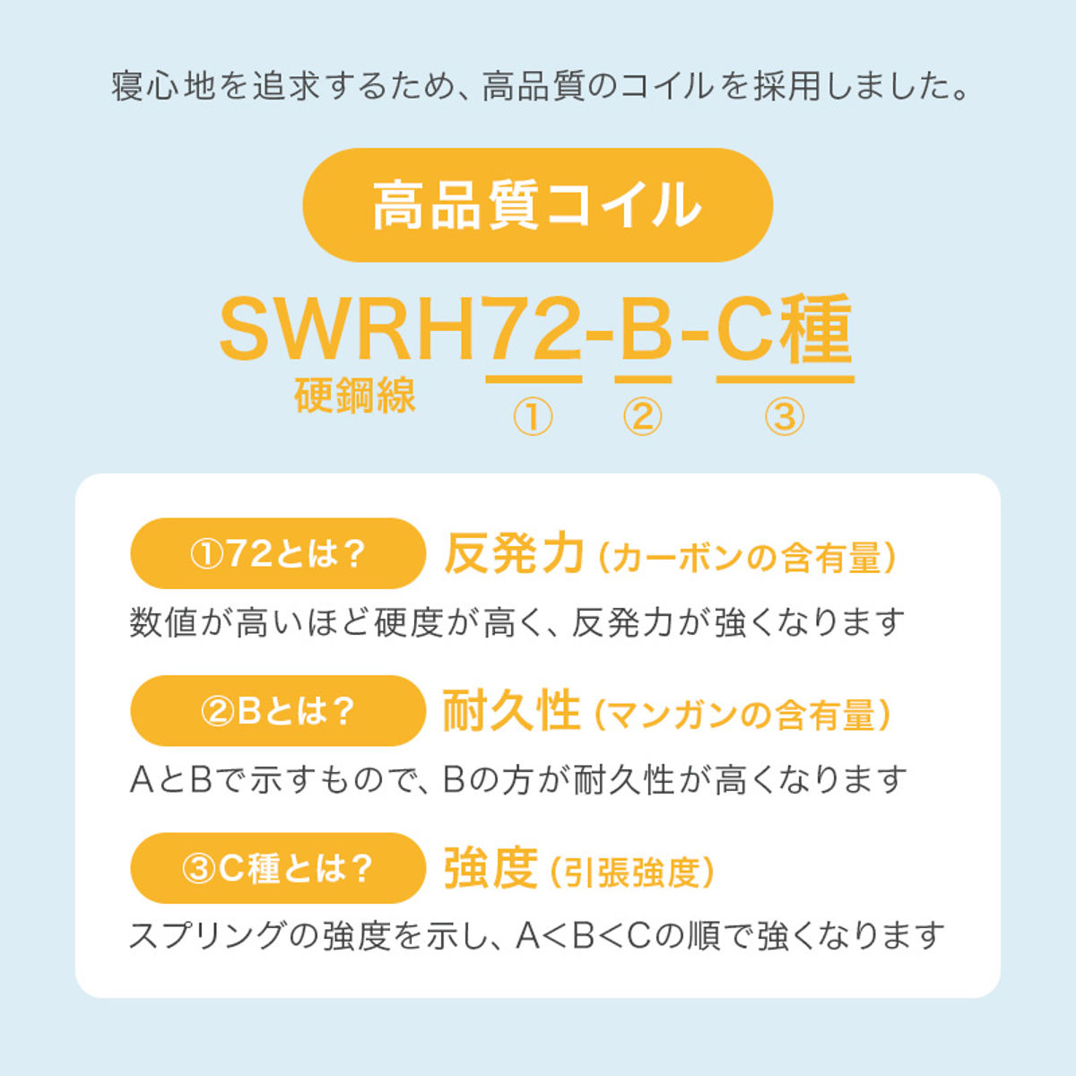 反発力、耐久性、強度に優れた高品質のコイルを採用しています。コイルの上にウレタンや圧縮フェルトを重ねたこだわりの内部構造です。約14.5cmの程よい厚みで底付きを感じることなく快適にお休みいただけます。