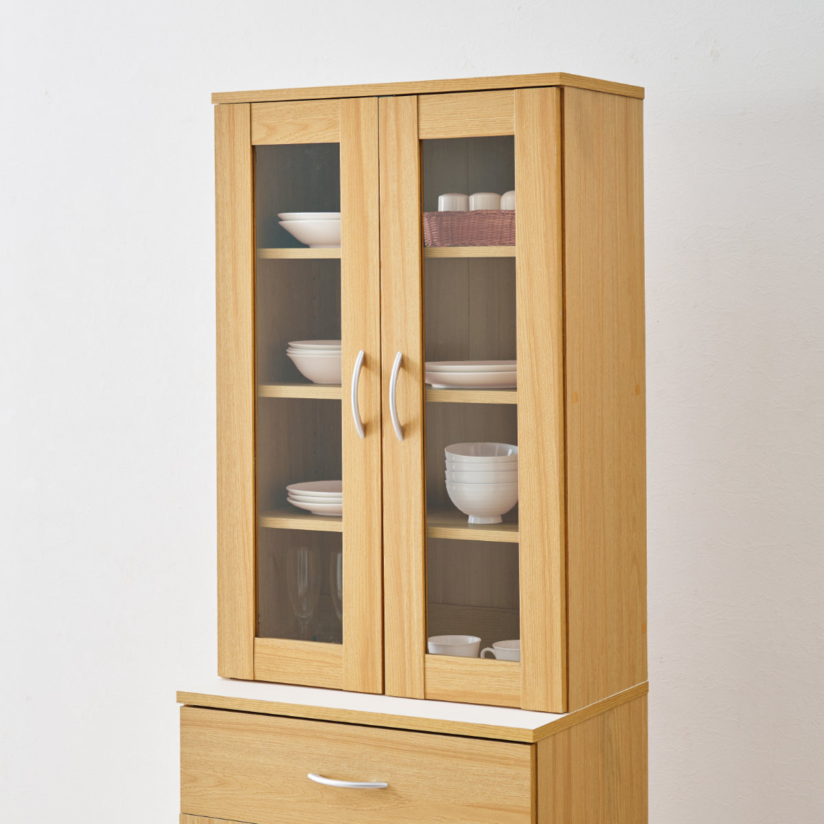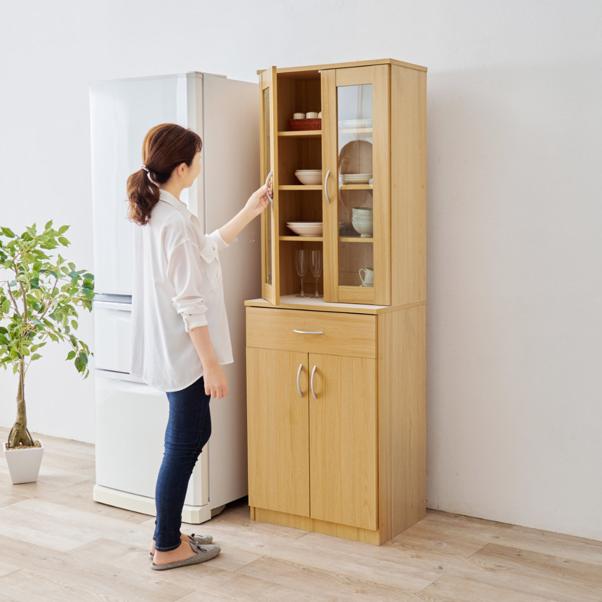 限られたスペースにも置きやすい、スリムタイプの食器棚です。幅59cmのスリムサイズですが、高さを活かした収納力で食器やキッチン用品をまとめて収納できます。