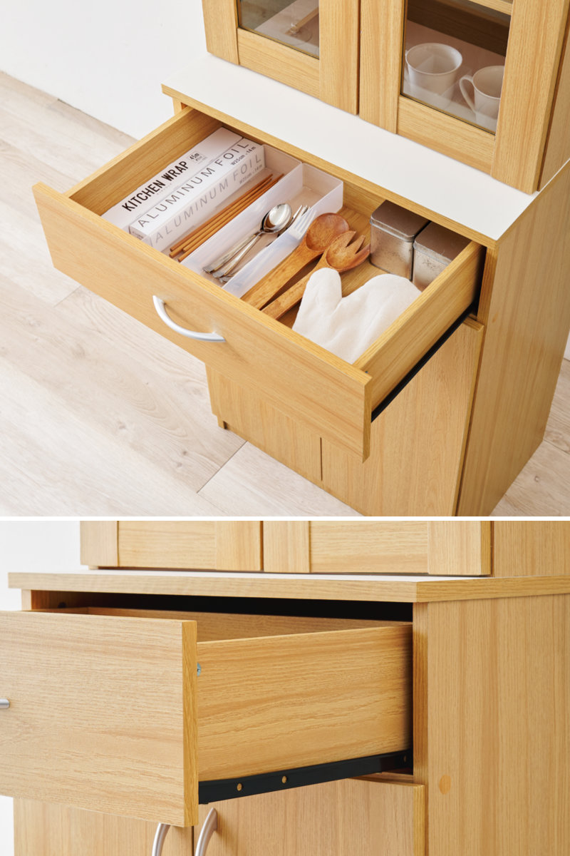 カトラリーや布巾などの小物を整理できる引出し収納。スライドレール仕様なので、開閉がスムーズです。