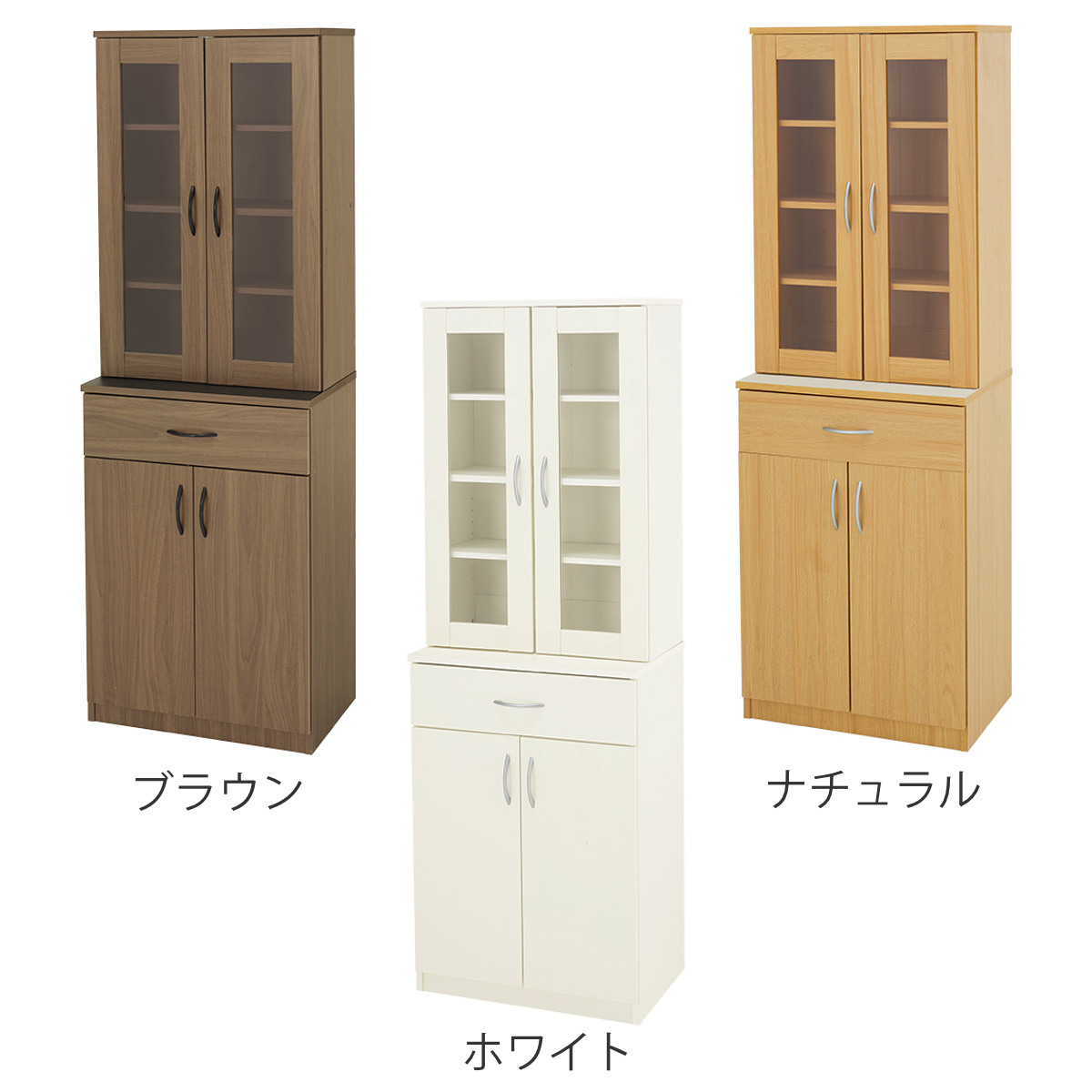 シックで重厚感のあるブラウン、温かな風合いのナチュラル、明るく清潔感のあるキッチンにぴったりなホワイトの3種類。ベーシックなカラーリングとシンプルなデザインで、どのカラーもインテリアに合わせやすいです。