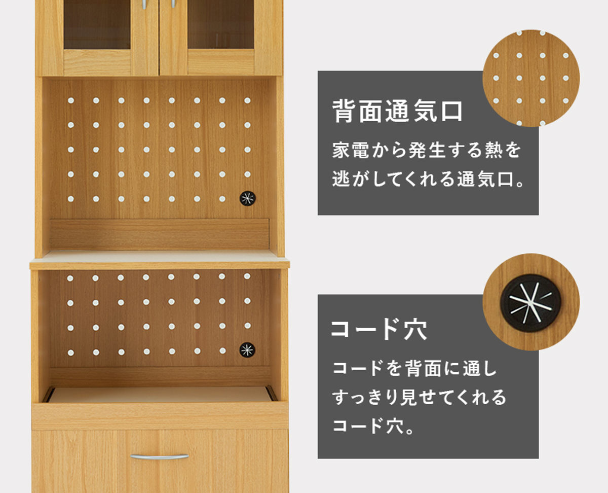 オープンスペースとスライド収納の背面には、熱を逃がしてくれる通気口と、コードを背面に通せるコード穴加工が施されています。