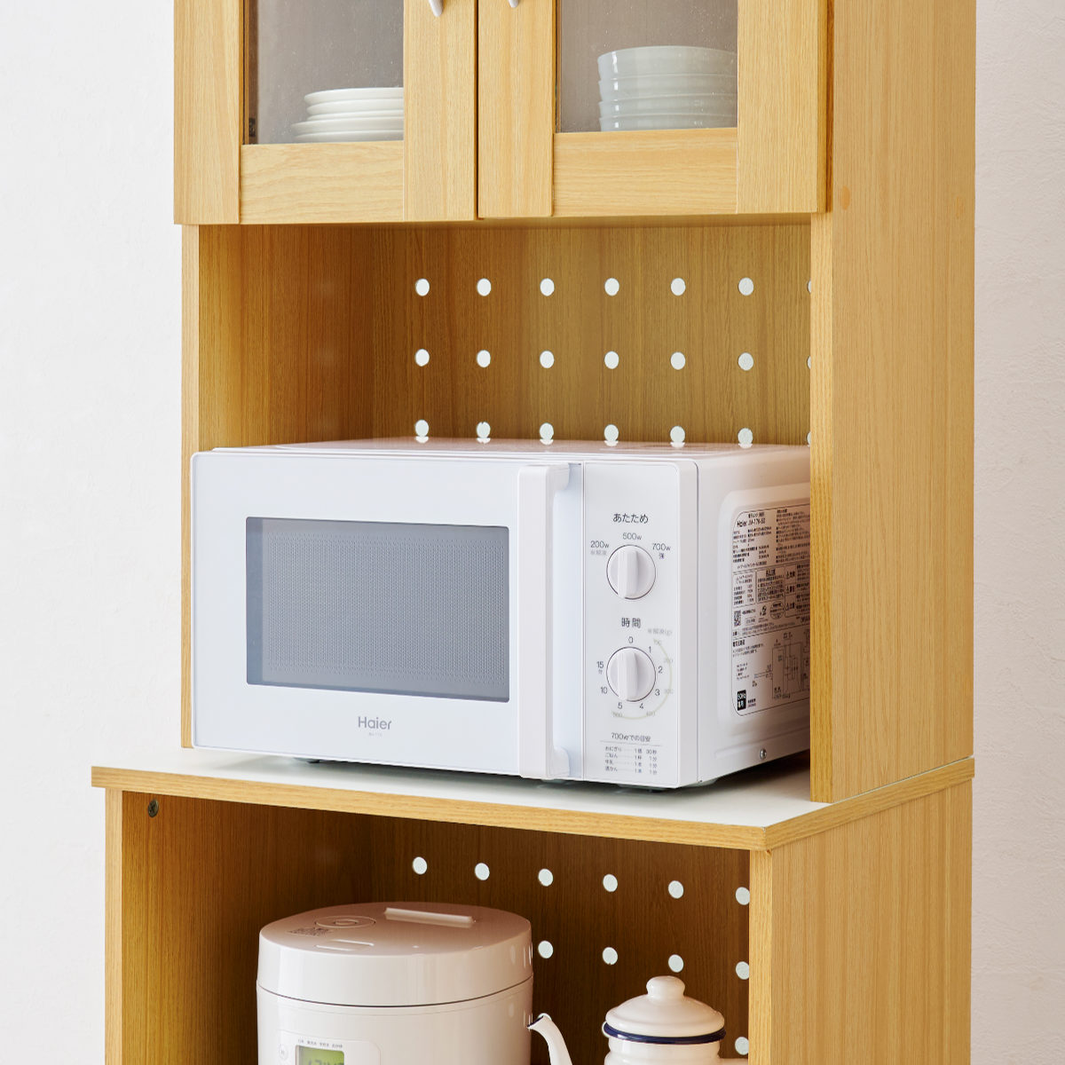 オープンスペースは、電子レンジなどの家電の設置や作業台としてお使いいただけます。水や汚れに強い素材、PVCを採用しているので、汚れてしまってもサッと拭き取ることができます。