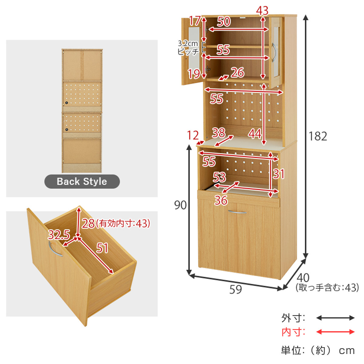 限られたスペースにも置きやすい、スリムタイプのキッチンボードです。幅59cmのスリムサイズですが、高さを活かした収納力で食器やキッチン用品をまとめて収納できます。