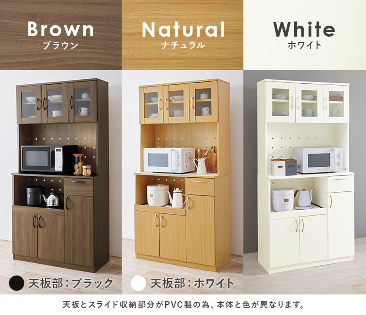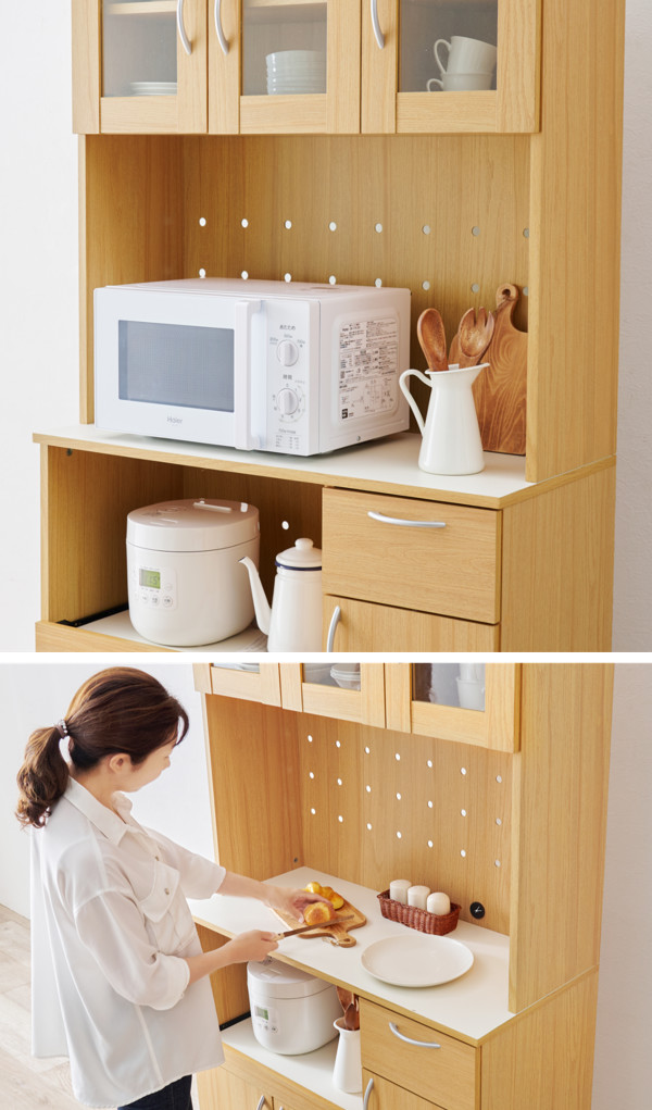 家電も食器もまとめて収納できる大容量タイプのキッチンボードです。引出しやスライド収納、大きさの違う扉収納などの機能がたくさん。幅89cm高さ182cmのたっぷりサイズで、収納力が抜群です。