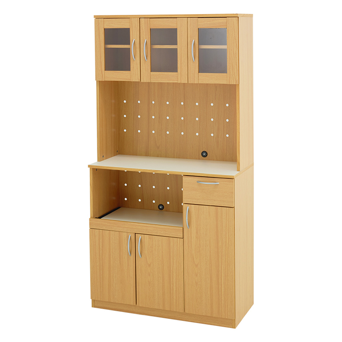 家電も食器もまとめて収納できる大容量タイプのキッチンボードです。引出しやスライド収納、大きさの違う扉収納などの機能がたくさん。幅89cm高さ182cmのたっぷりサイズで、収納力が抜群です。